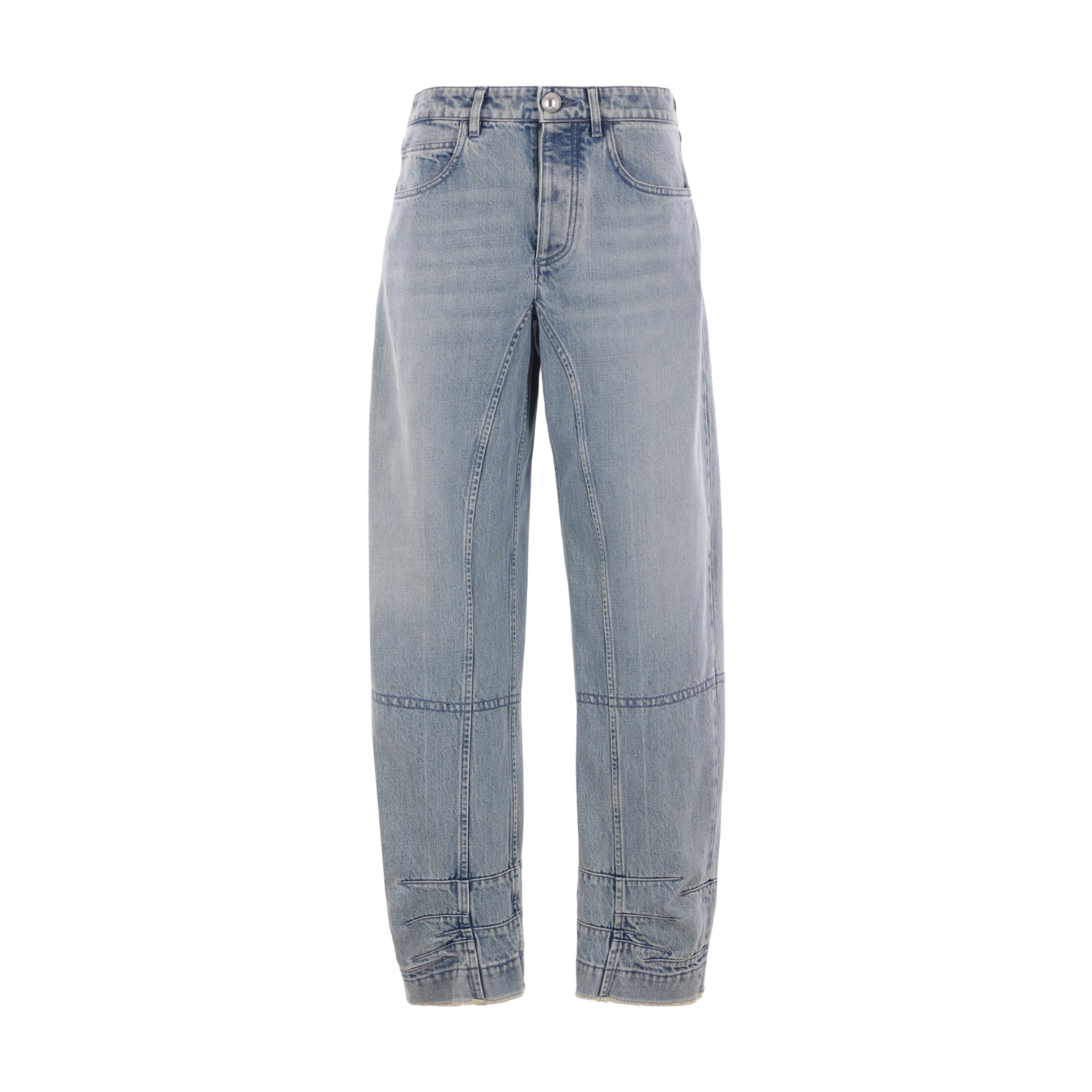 Jil Sander Tapered Leg Jeans. Blue cotton jeans with tapered leg, washed denim, whiskering effect. Belt loops, concealed fly and button fastening, classic five pockets. Logo patch to the rear and frayed hem.