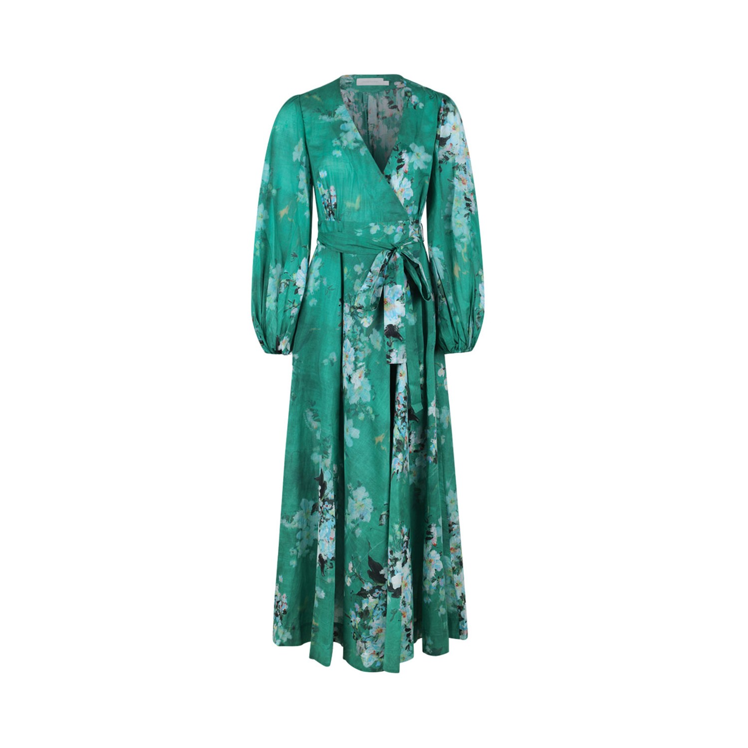 Zimmermann Everley Wrap Dress. Green cotton wrap dress, watercolour floral print, elasticated cuffs. V neck, long sleeves.