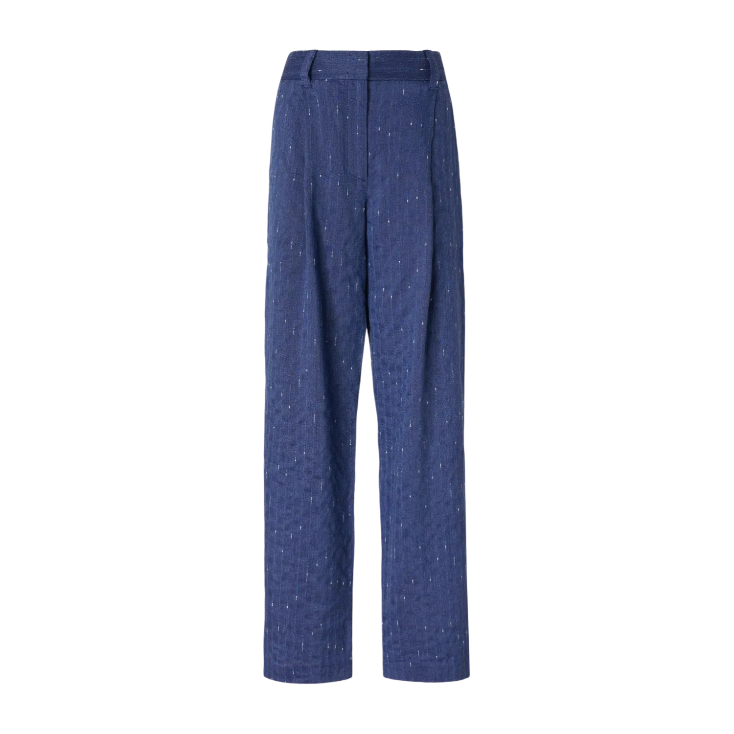Genny Pinstriped Trousers. These pinstriped tailored long trousers feature a straight and elegant line, with a pleat at the waist that adds structure and refinement to the design. The regular waist is finished with a belt, while the French pockets on the sides and the back pockets with flap complete the luxurious and sophisticated look.