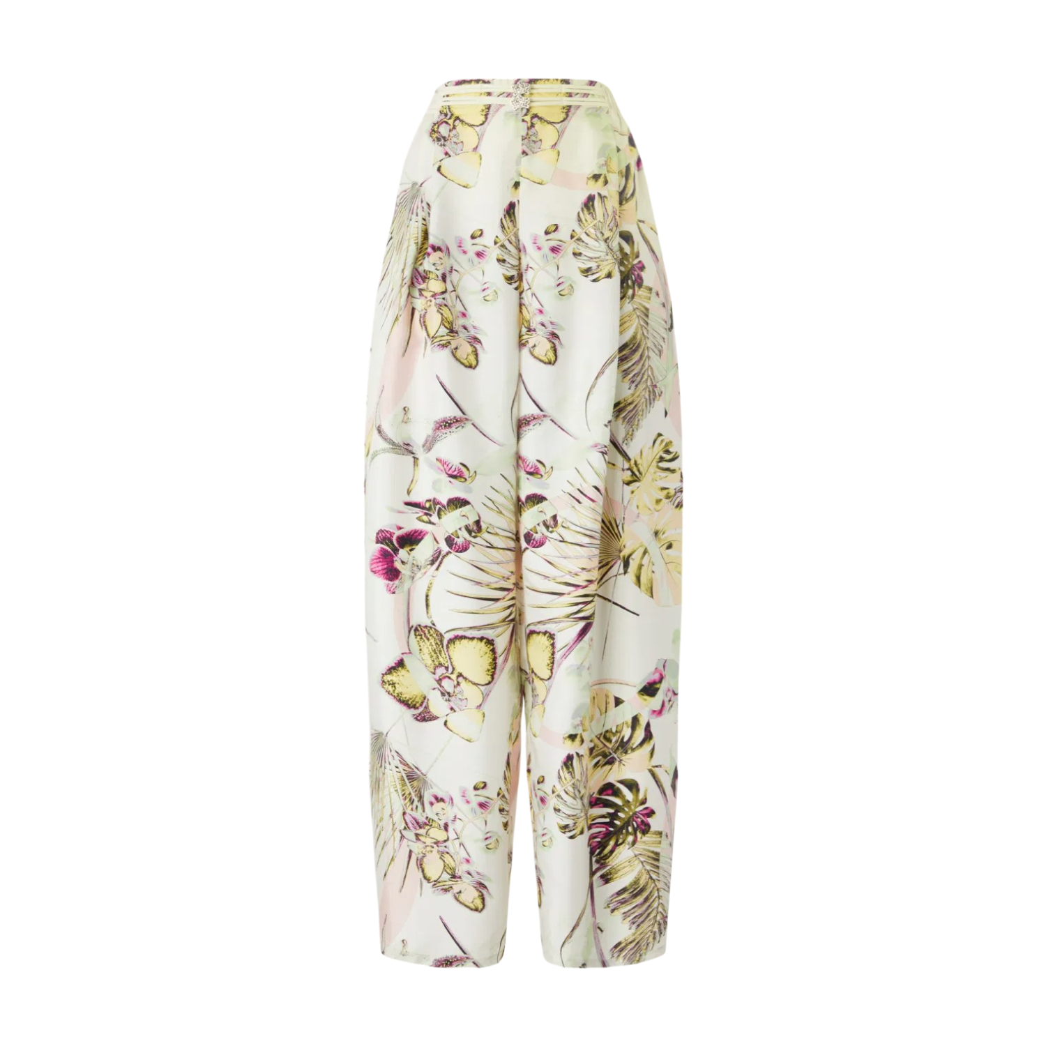 Genny Jungle Orchids Silk Trousers. These wide leg trousers from Genny are designed to offer elegance and comfort. Featuring a regular waist with an elastic waistband and decorated with straps and buttons on the front, they add a chic detail to the design. The front pleats give movement and fluidity, while the seam pockets on the sides ensure practicality.