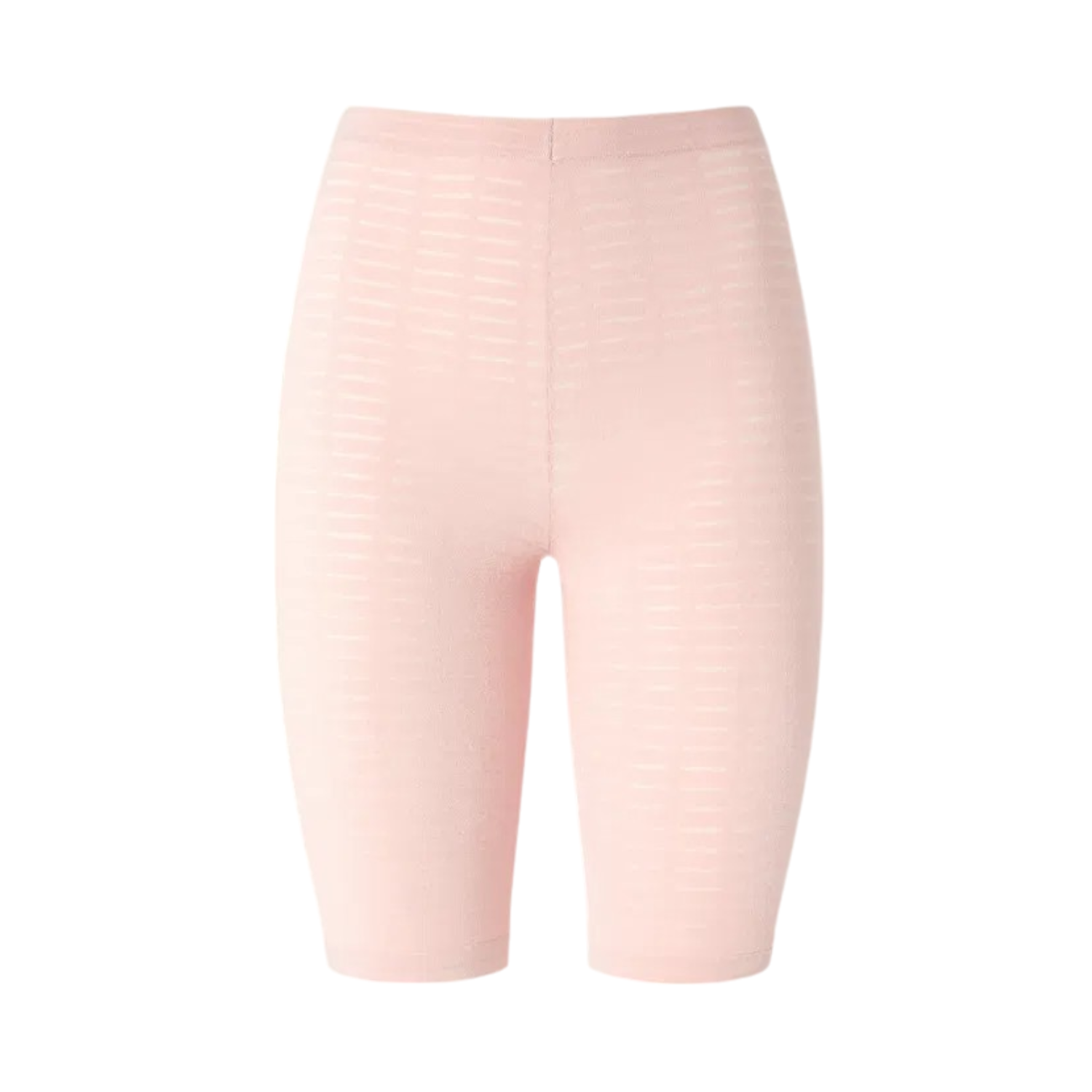 Genny High-Waisted Knit Shorts. Elegant and versatile, these high-waisted knit shorts stand out for their slim fit and mid-calf length. Crafted from a thin, shiny, silky stretch viscose, they feature the iconic JLO motif printed with a devore technique, for a sporty chic concept.