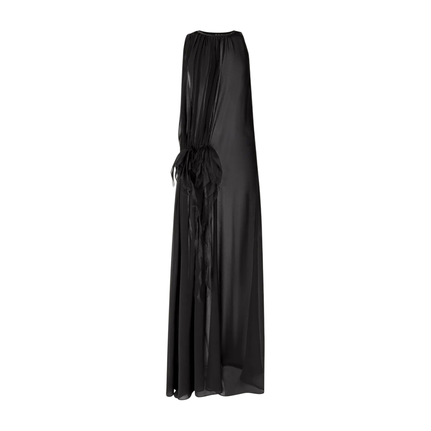 Genny Black Long Embroidered Dress. This sleeveless long dress, with a refined crew neck, embodies elegance and femininity. The design is embellished with a delicate side gathering that adds movement, while a soft flower on the side gives a romantic touch. The micro sequin embroidery illuminates the garment with a discreet elegance. The flared line and fluid fit ensure comfort and grace on every occasion.