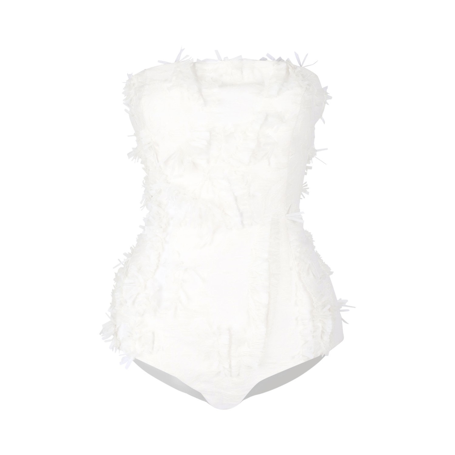 Hui Milano Strapless Bustier Bodysuit. White bodysuit with a structured, strapless design. Features all-over tonal fringe embellishments creating a textured, three-dimensional effect. Form-fitting silhouette with contouring construction and concealed back fastening.