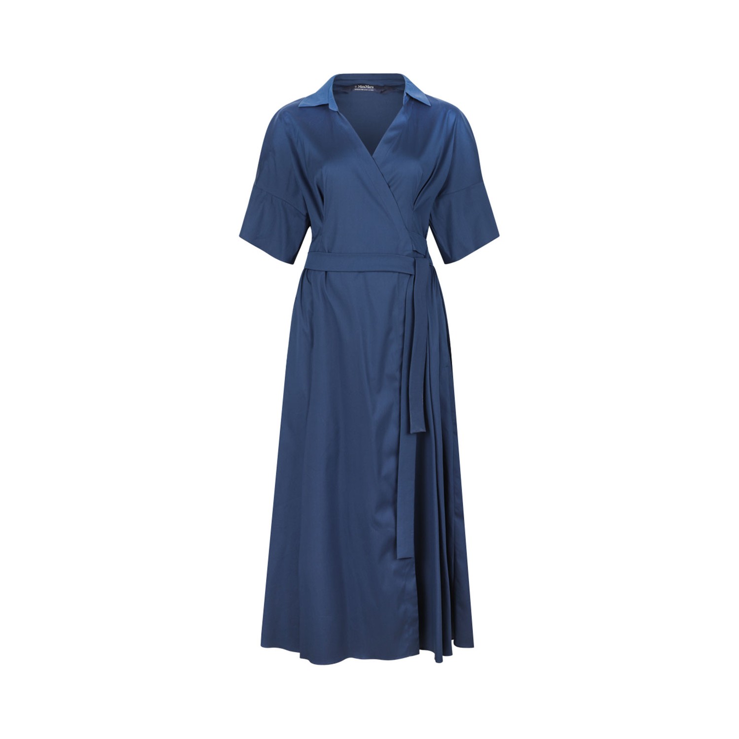 Max Mara Bluette Wrap Dress. Long chemisier dress in soft stretch cotton poplin. The model features a shirt collar crossed on the front, short kimono sleeves with wide cuffs and pockets inset on the sides. The full skirt with pleated motif on the back closes like a wrap with a matching belt to tie on the front.