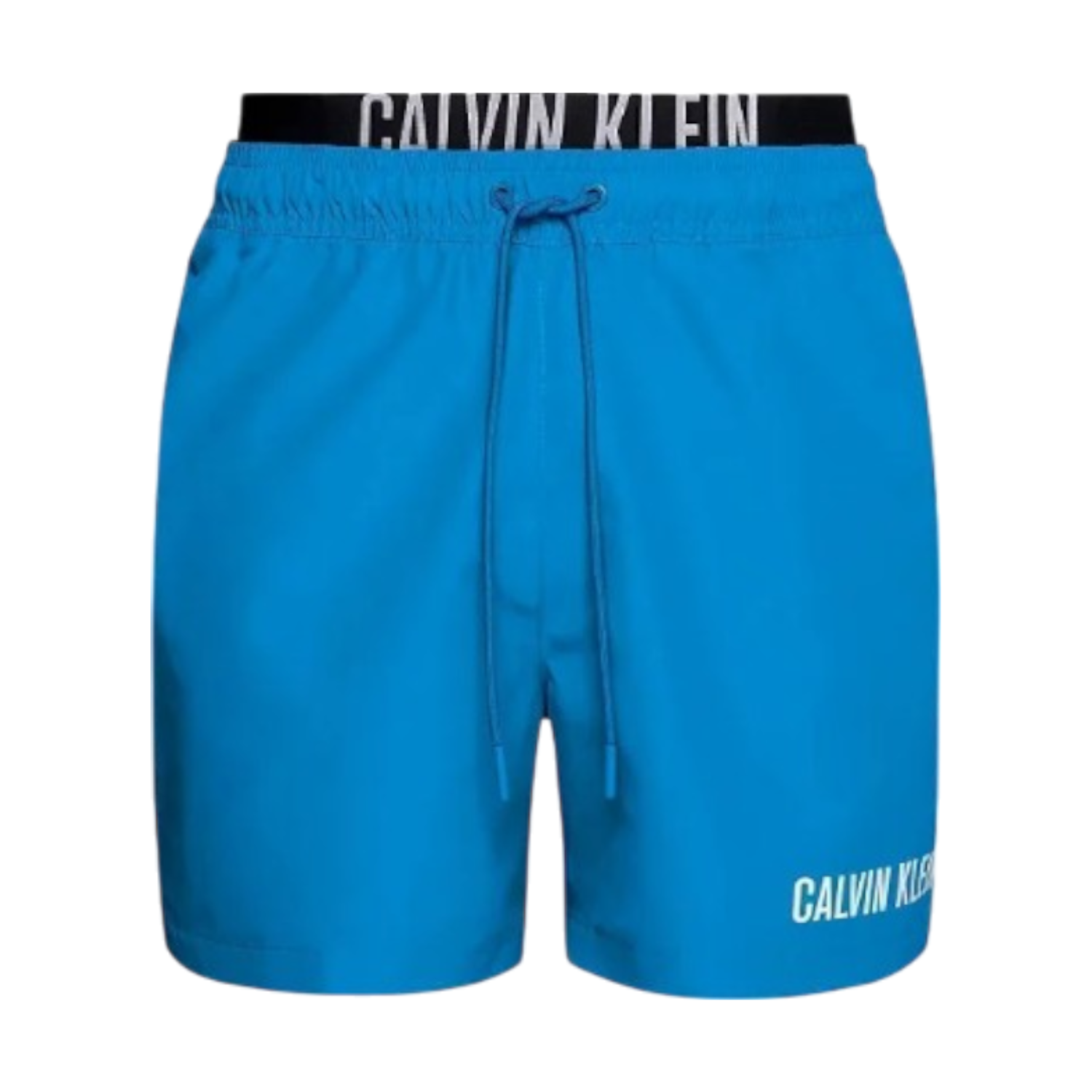 Calvin Klein Blue Swim Shorts. Blue swim shorts with logo print to the front, double waistband with logo print.