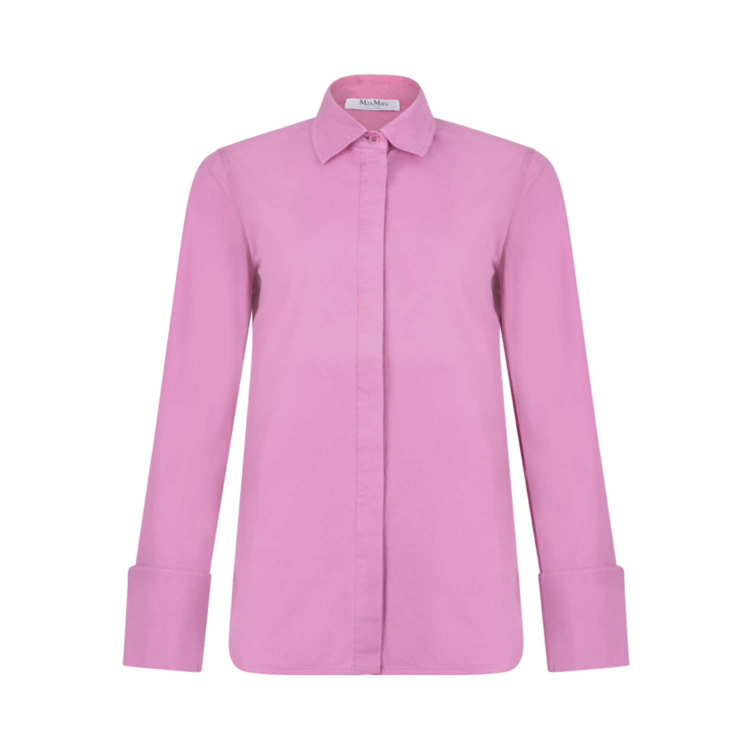 Max Mara Peonia Pink Logo-Embroidered Shirt. Peonia pink cotton blend shirt with poplin texture, tonal design, tonal stitching, classic collar. Long sleeves with folded buttoned cuffs, cufflinks, embroidered logo to the front. Box-pleat detail to the rear, curved hem and concealed front button fastening.