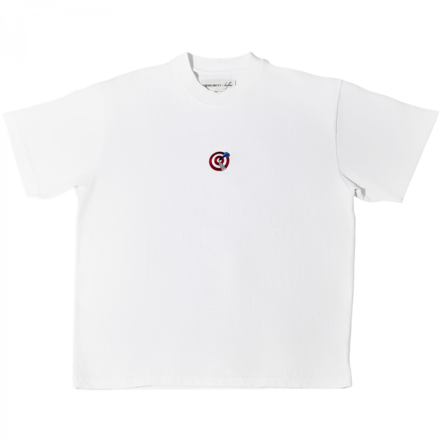 Beefbar White Target T-Shirt. White cotton t-shirt with embroidered graphic print to the front, short sleeves, embroidery tone on tone in the back.