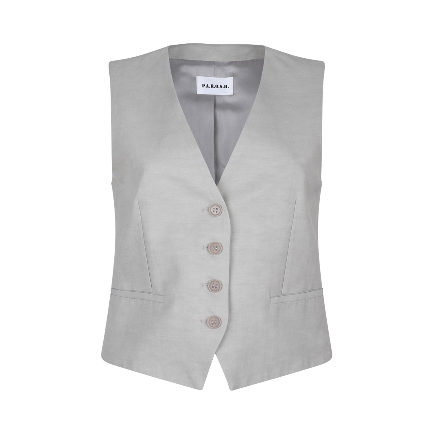 P.A.R.O.S.H. Light Beige Gilet. Light beige V neck gilet, front button fastening, two side welt pockets, sleeveless, strap detailing.