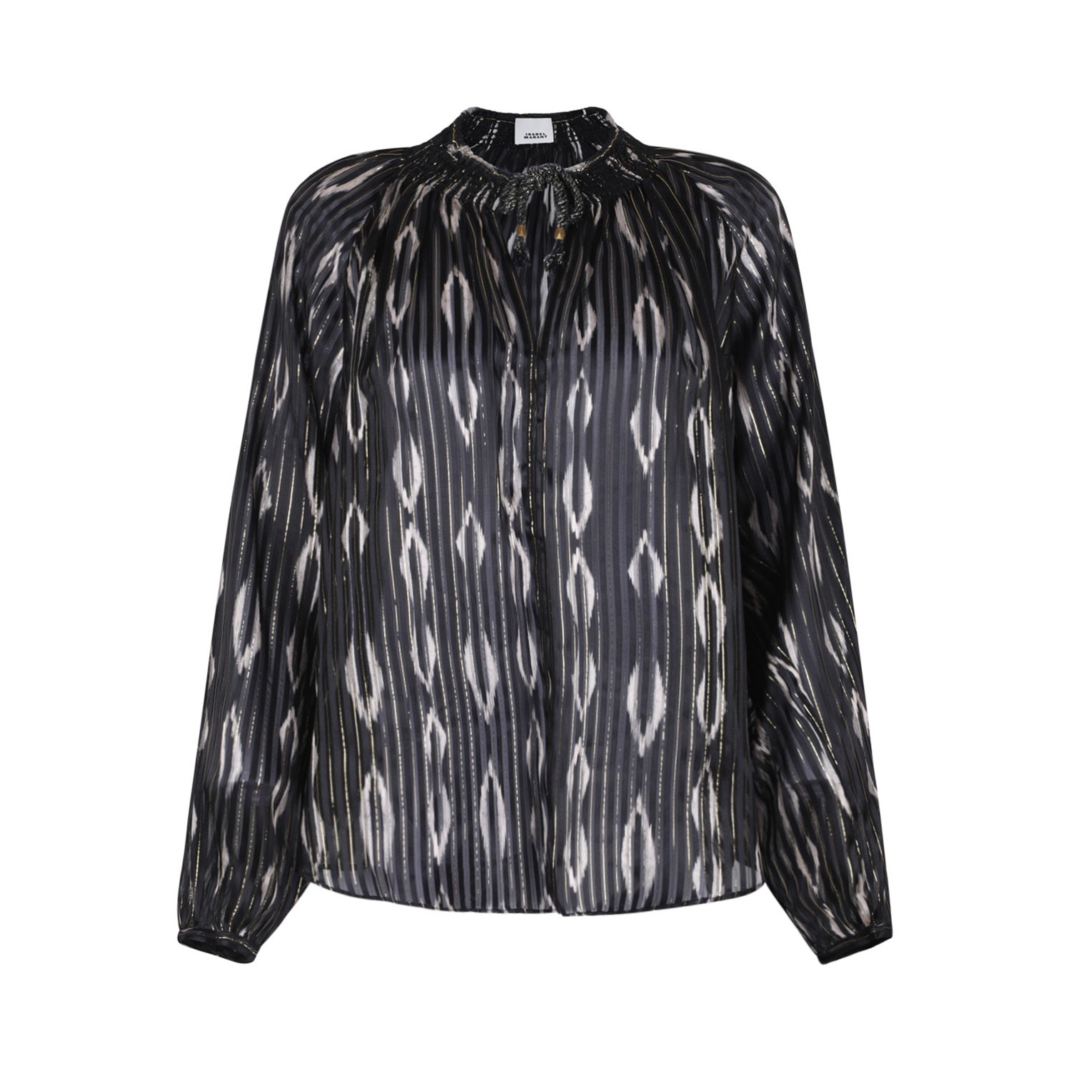 Isabel Marant Syra Blouse. Syra blouse silk blend blouse with textured finish, plisse details, geometric print. Front lace-up fastening, long sleeves, straight hem.