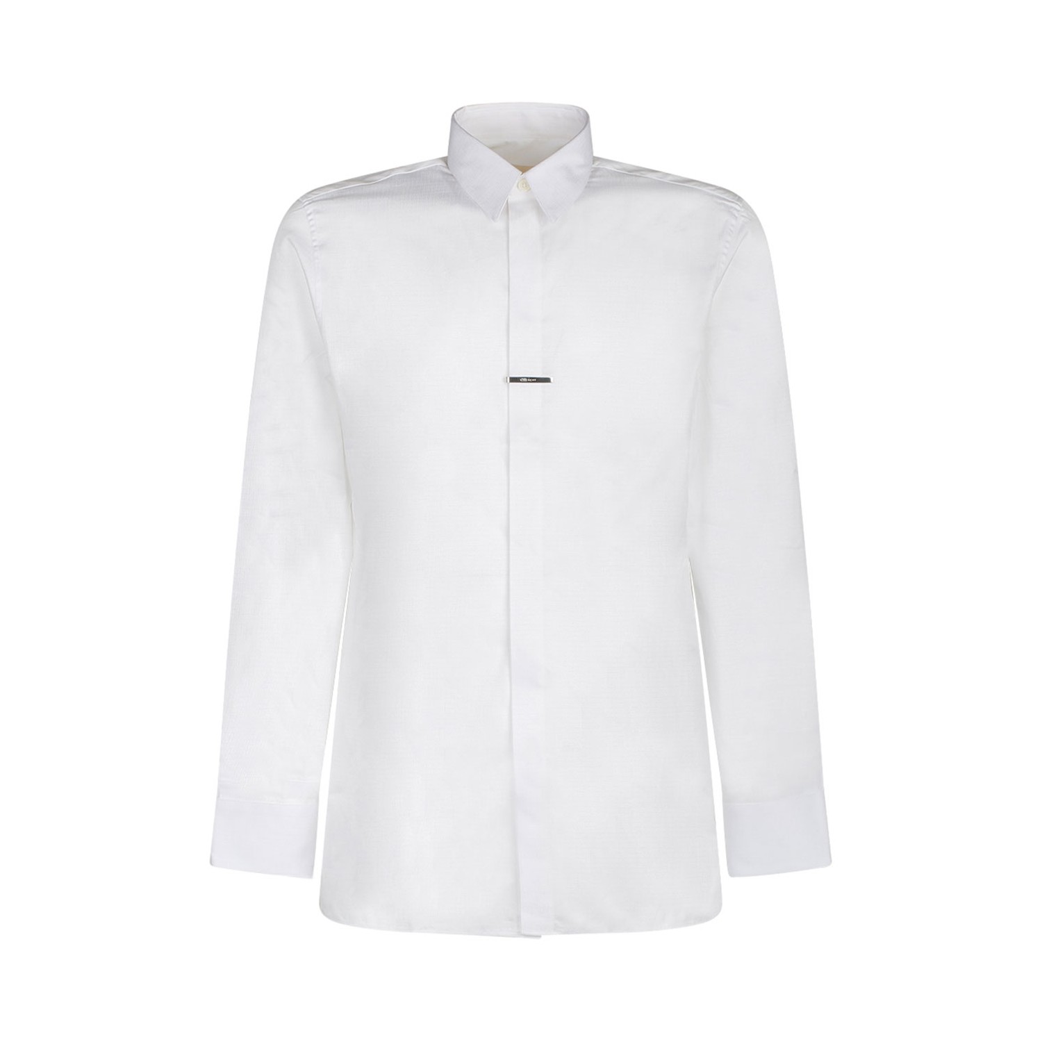 Givenchy White Logo Plaque Shirt. White cotton shirt, ripstop texture, silver tone logo plaque, pointed flat collar, concealed front fastening, long sleeves, buttoned cuffs, straight hem.