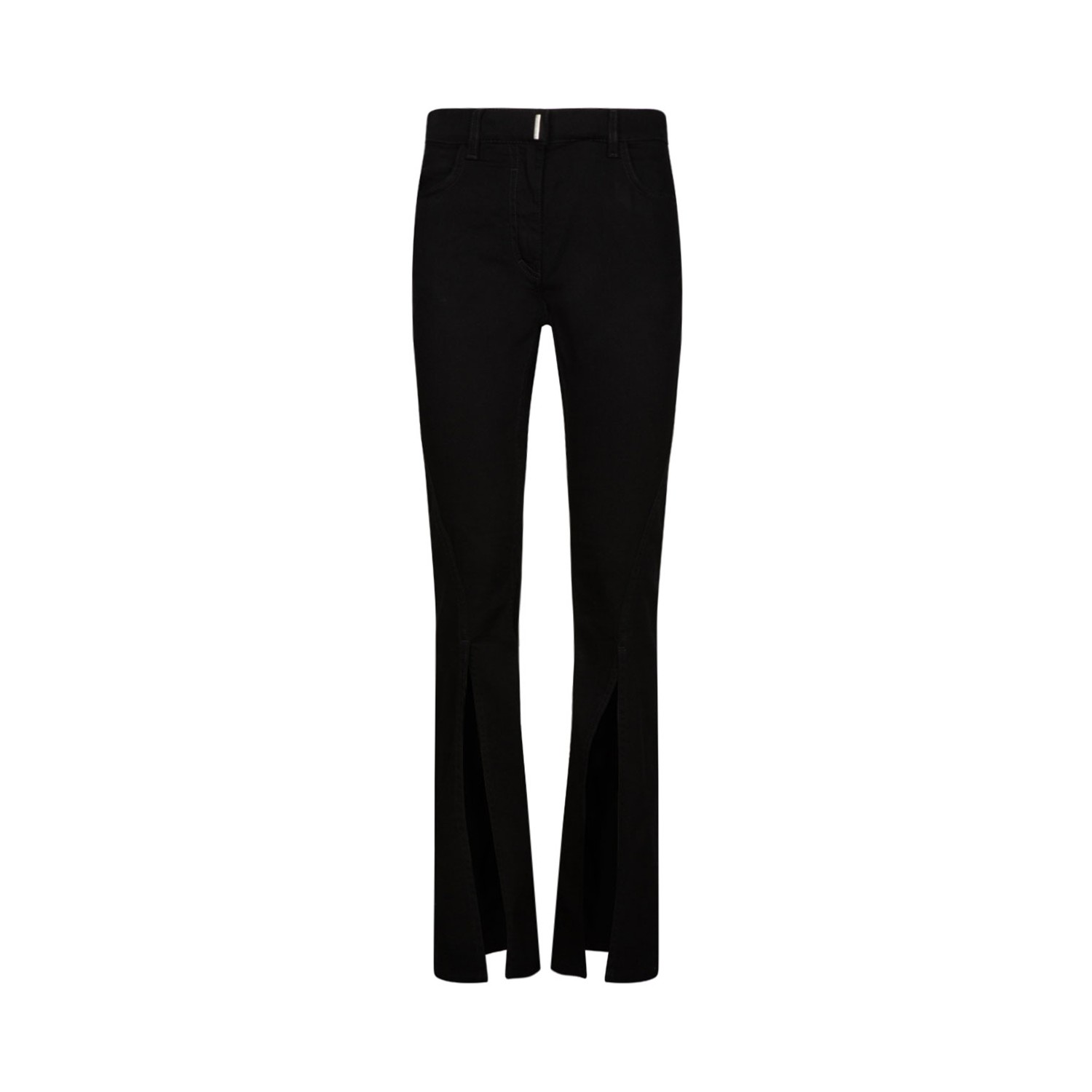 Givenchy Black High Waist Trousers. Black stretch-cotton denim trousers, silver-tone logo plaque, high-waisted, belt loops. Concealed front fastening, classic five pockets, flared.