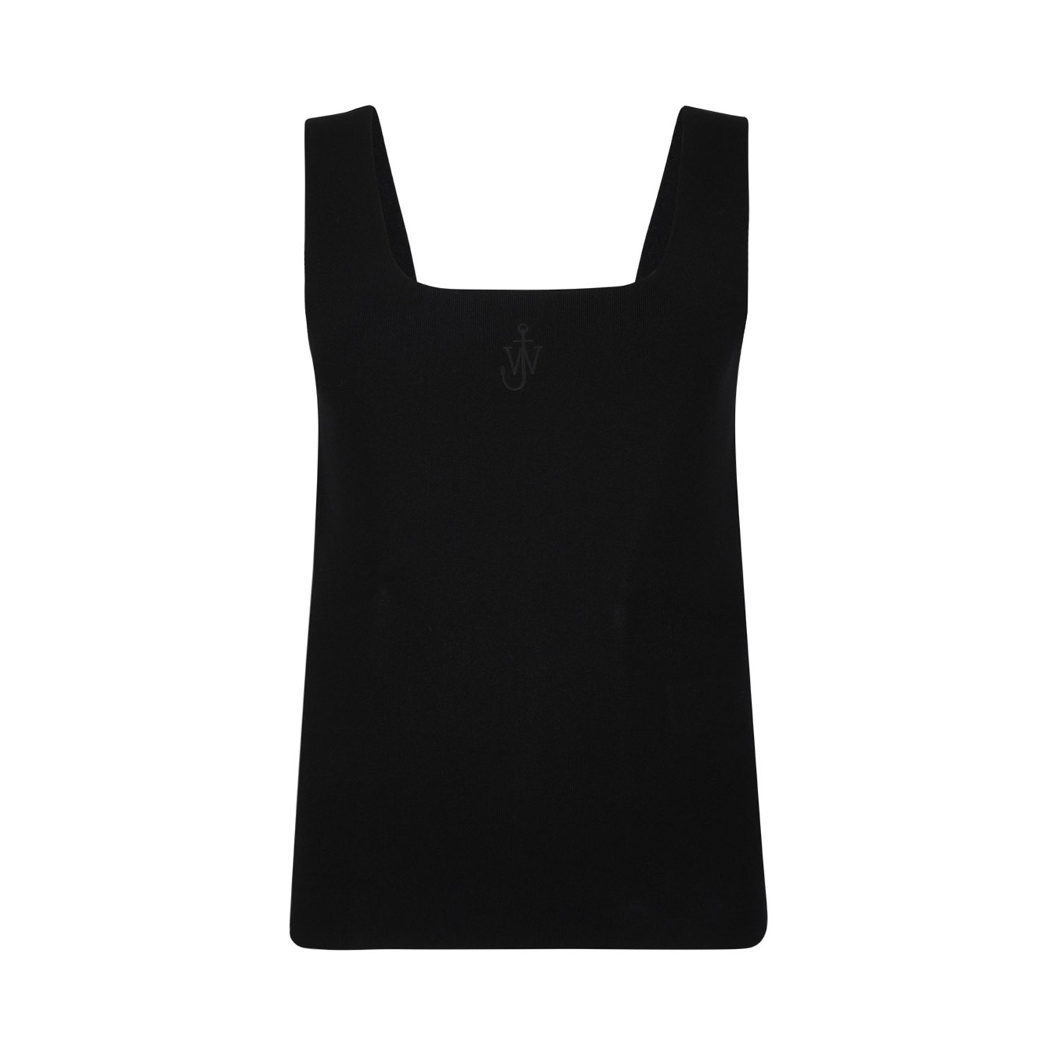 JW Anderson Black Anchor-Embroidered Tank Top. Black recycled viscose blend tank top with signature JW-initials anchor logo, square neck, wide shoulder straps, sleeveless and straight hem.