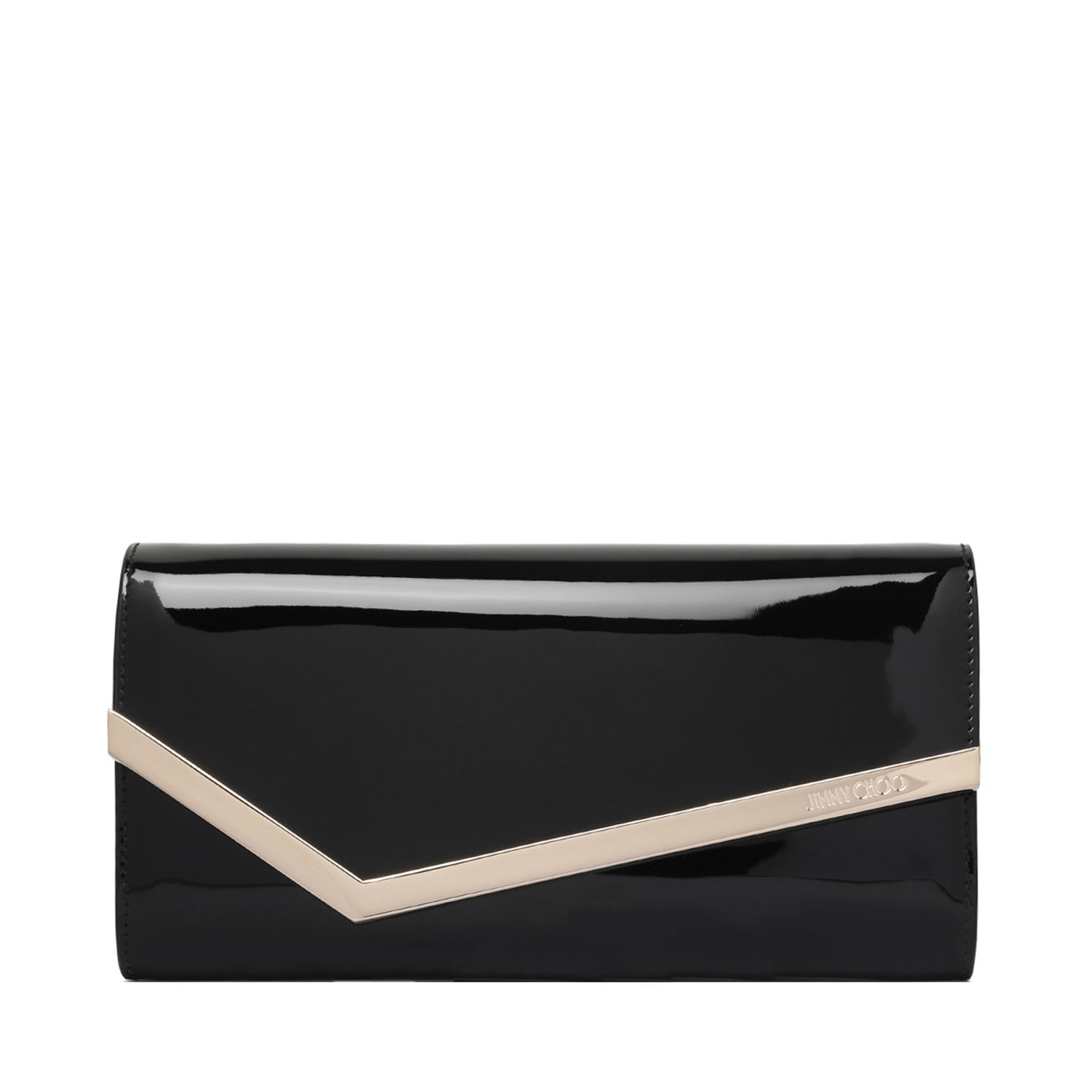 Jimmy Choo Black Emmie Clutch Bag. The Emmie clutch bag in patent leather has a clean and modern construction. This streamlined evening clutch features a Jimmy Choo engraved magnetic snap button closure on the front panel. The detachable chain adds freedom and versatility, so wear yours full length or carried in hand.