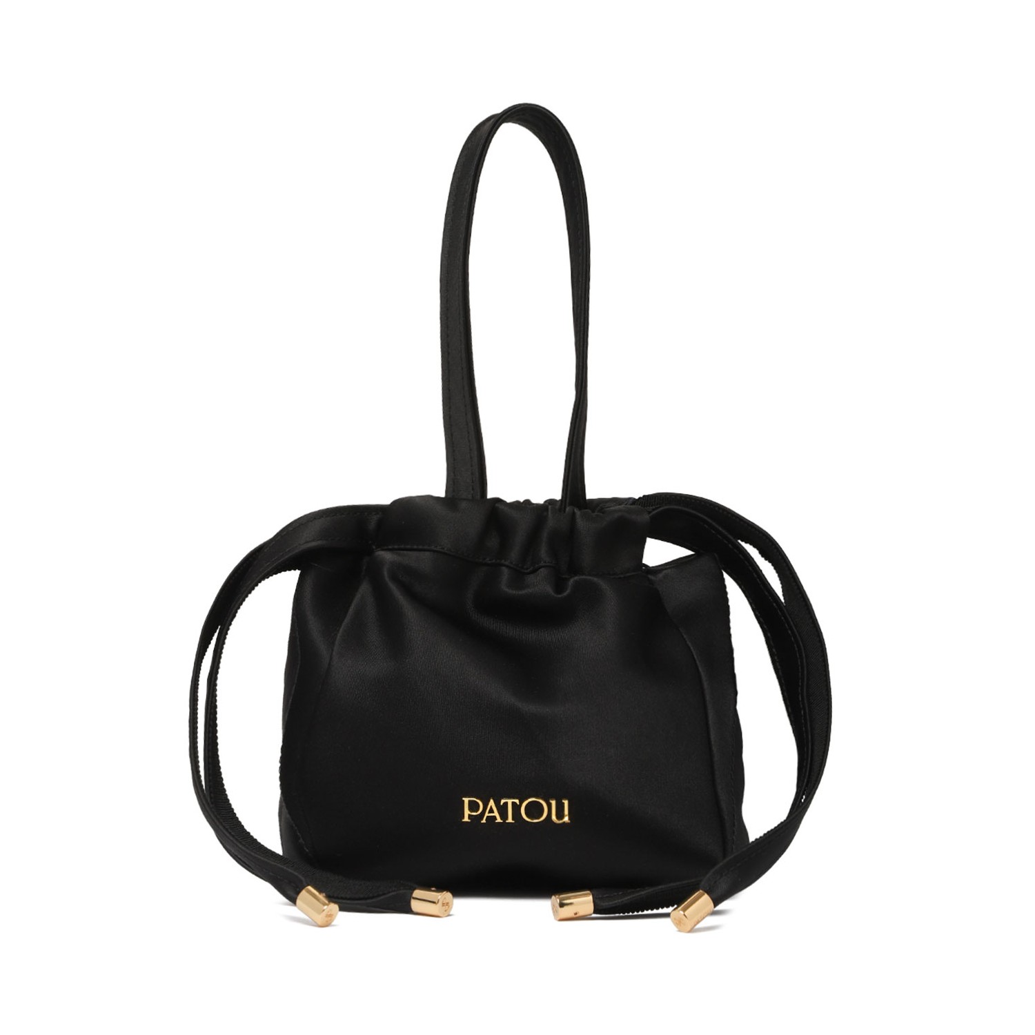 Patou Black Evening Clutch Bag. Black cotton clutch bag, gold-tone logo lettering, two top handles, drawstring fastening, main compartment.