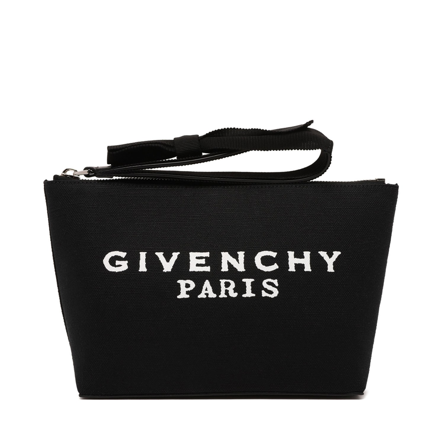 Givenchy Black Small Pouch In Canvas With Bow. Black pouch in cotton canvas with zipped closure, knotted gros grain covered leather strap. Givenchy Paris signature on the front, Givenchy Paris patch on the inside. One main compartment with one flat pocket inside, leather base.