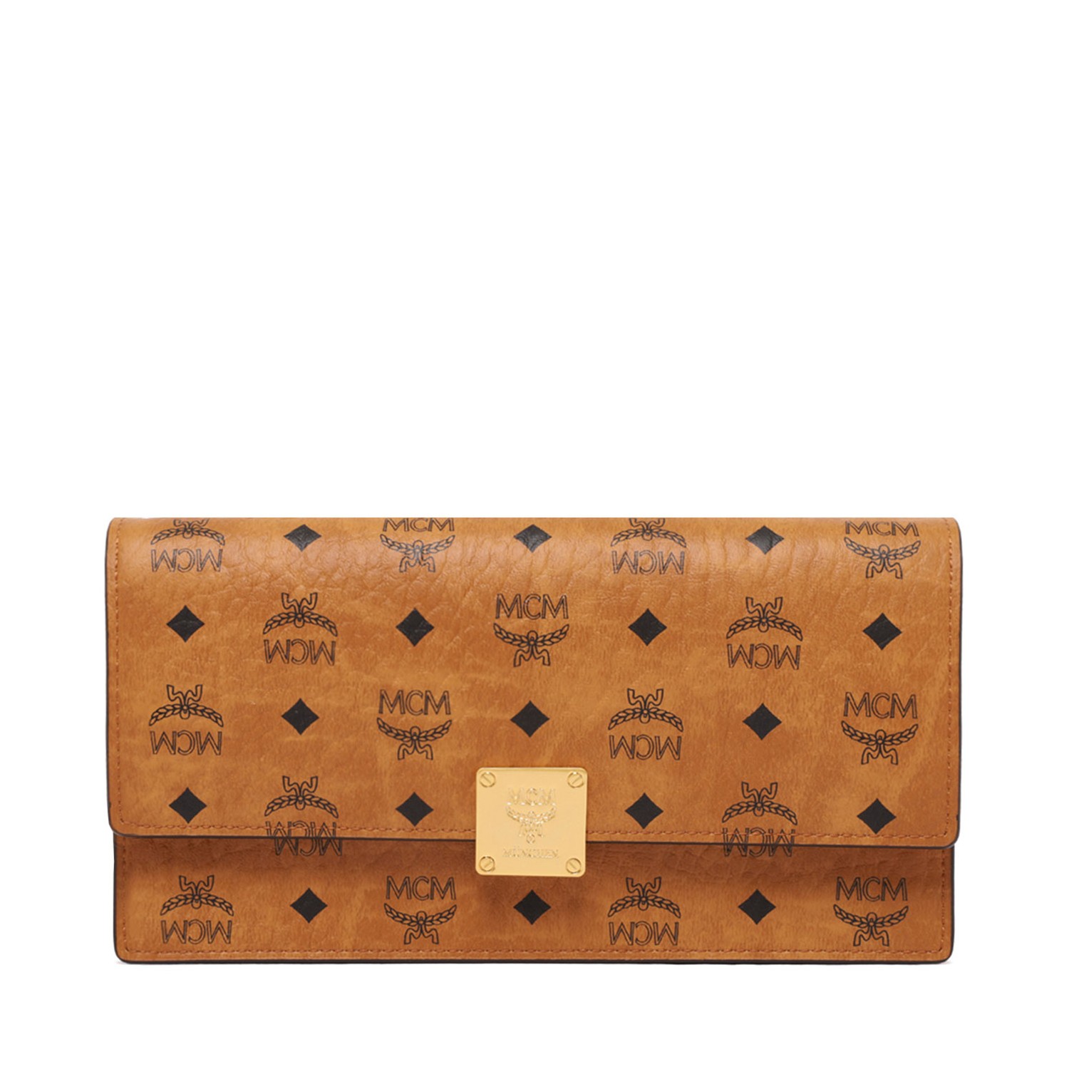MCM Brown Visetos Crossbody Clutch Bag. Brown crossbody cluth bag with monogram pattern, flap closure, shoulder strap, logo plaque and top handle.