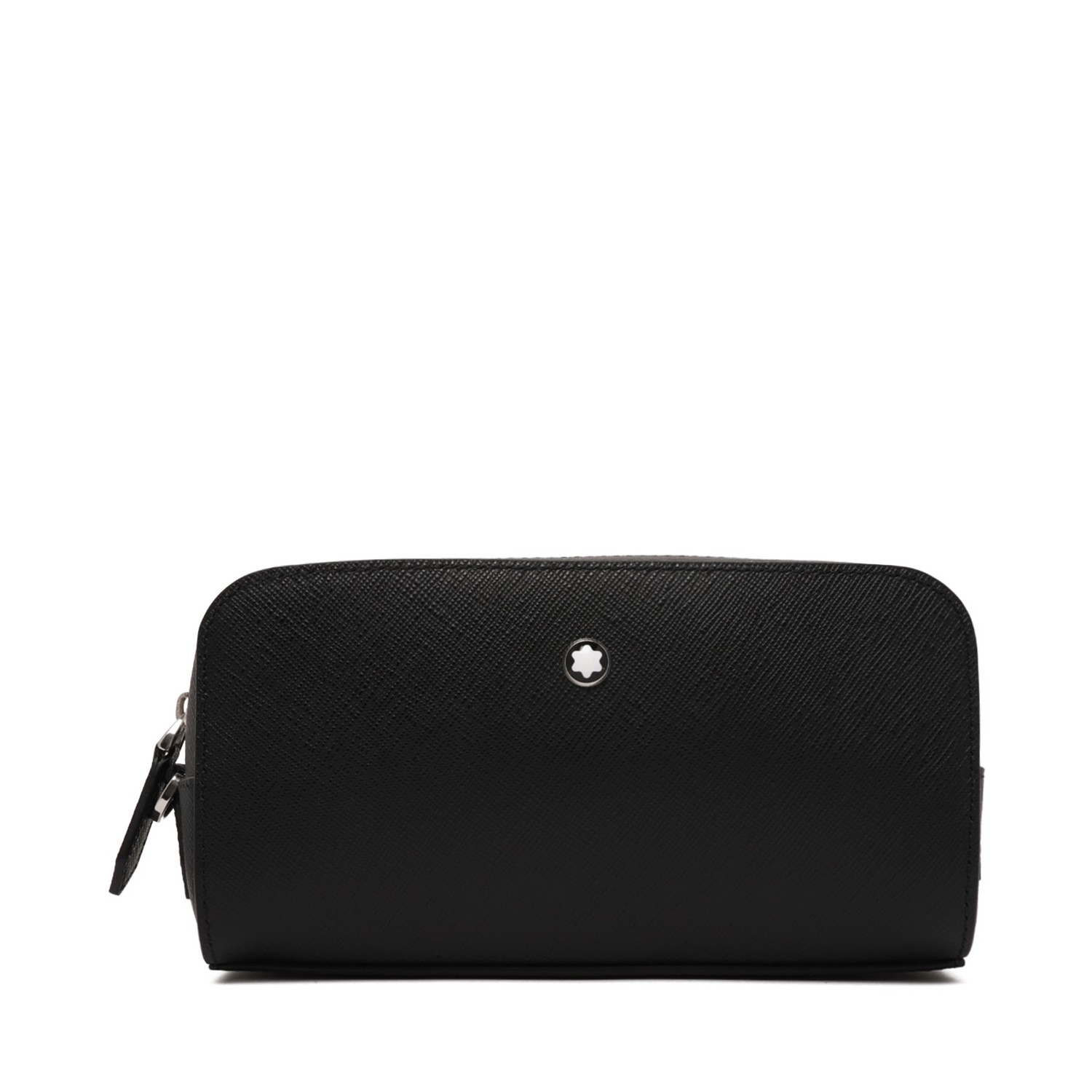 Montblanc Black Sartorial Leather Pouch. Black zip-around pouch with a sleek, refined design. Pouch crafted in Saffiano-embossed calf leather with a structured, durable finish. Featuring top zip closure, leather wrist strap, silver-tone hardware and the iconic Montblanc emblem on the front.