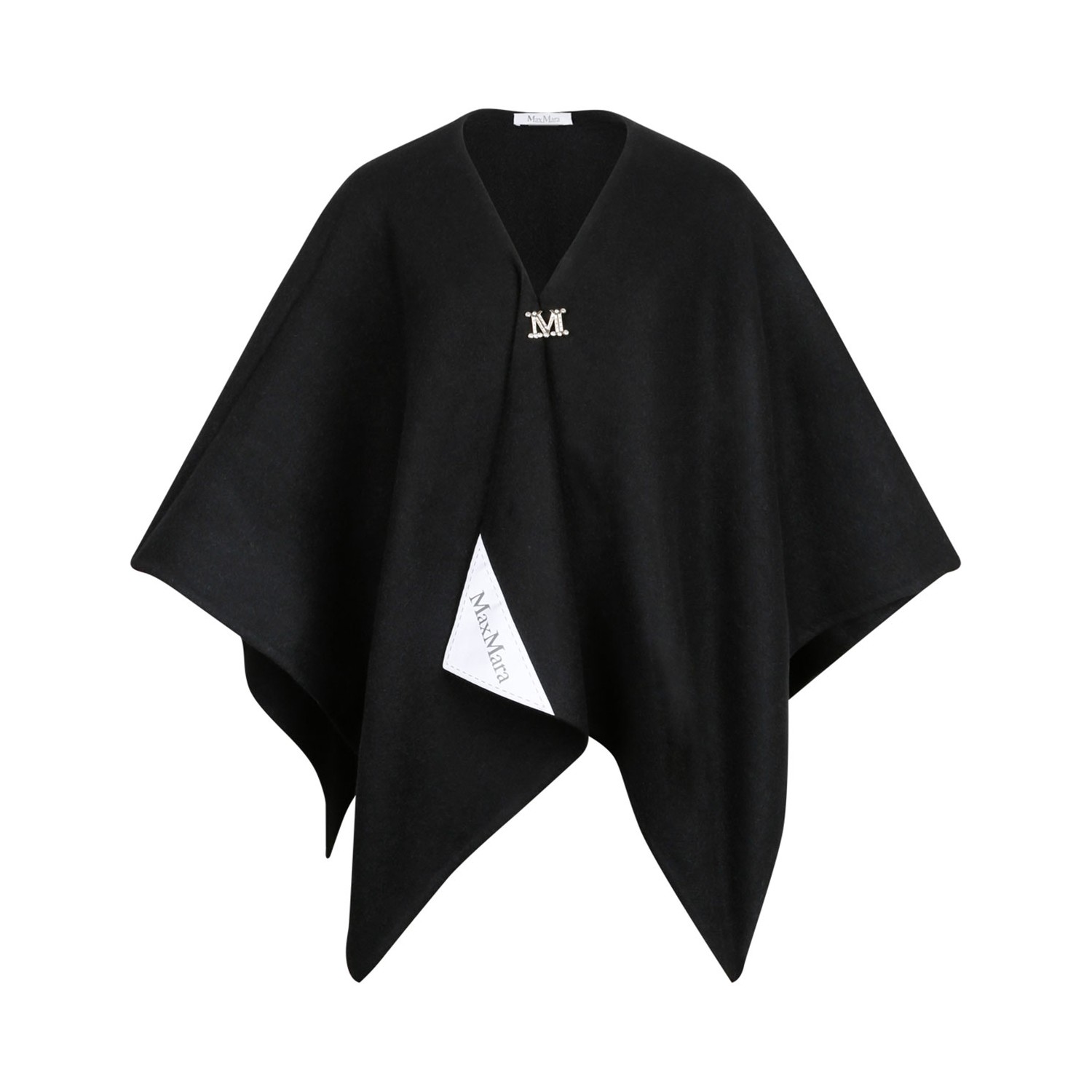 Max Mara Black Serra Cape. Black alpaca-wool blend cape with rhinestones, brooch, flared sleeves. V neck, double-breasted brooch closure.