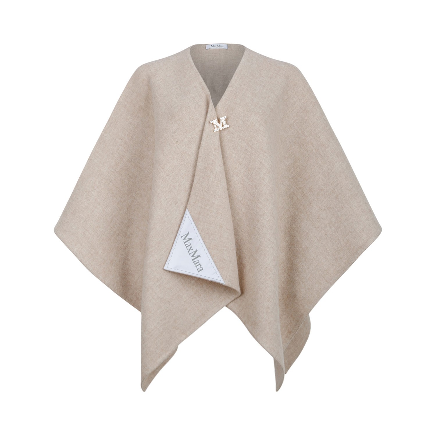 Max Mara Beige Serra Cape. Beige alpaca-wool blend cape with rhinestones, brooch, flared sleeves. V neck, double-breasted brooch closure.