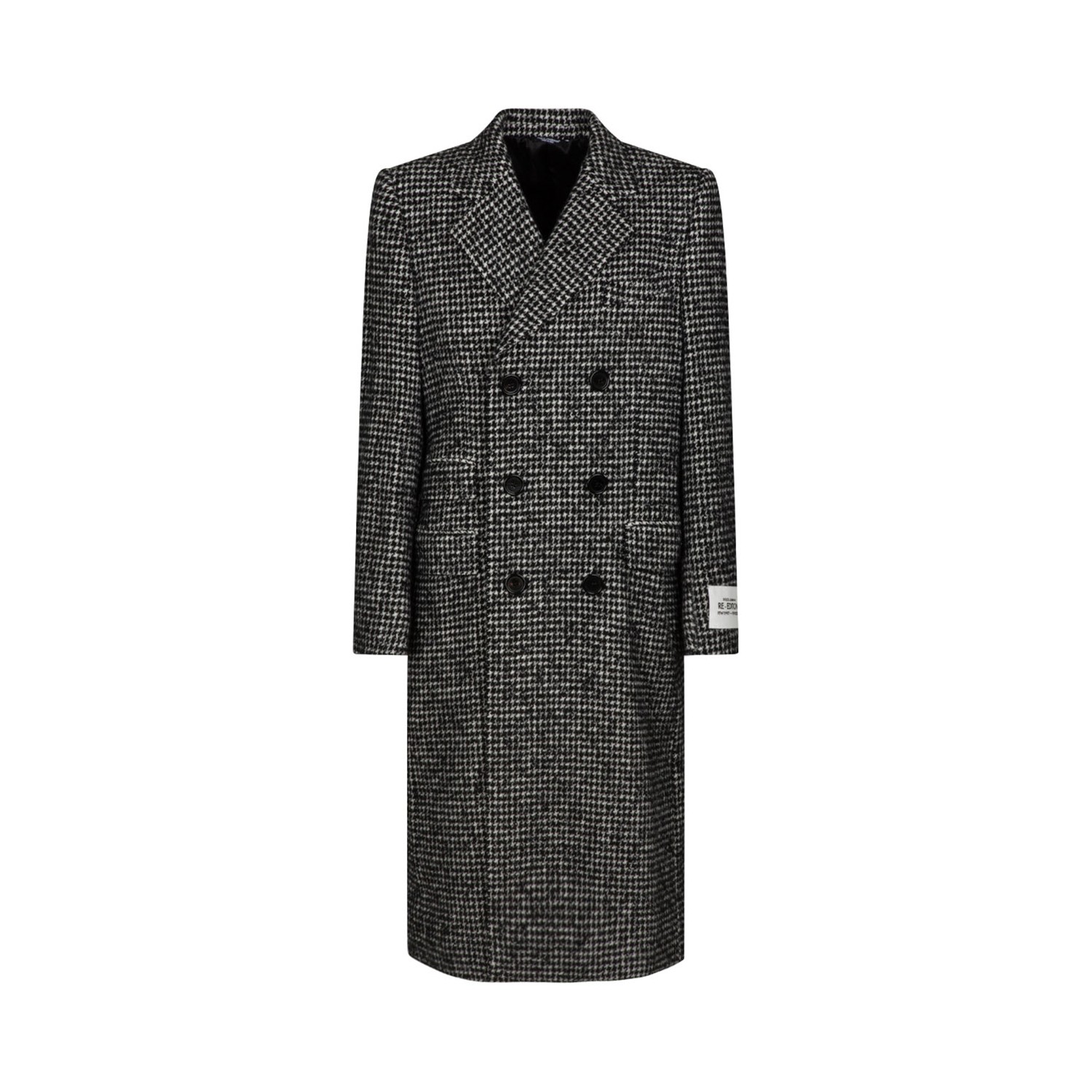Dolce & Gabbana Gray Double Breasted Coat. Grey double breasted houndstooth coat in technical wool with the Re Edition label. Mirrored lapels, button fastening, flap pockets, a welt breast pocket and inner welt pockets with button, buttoned cuffs, central vent, lined.