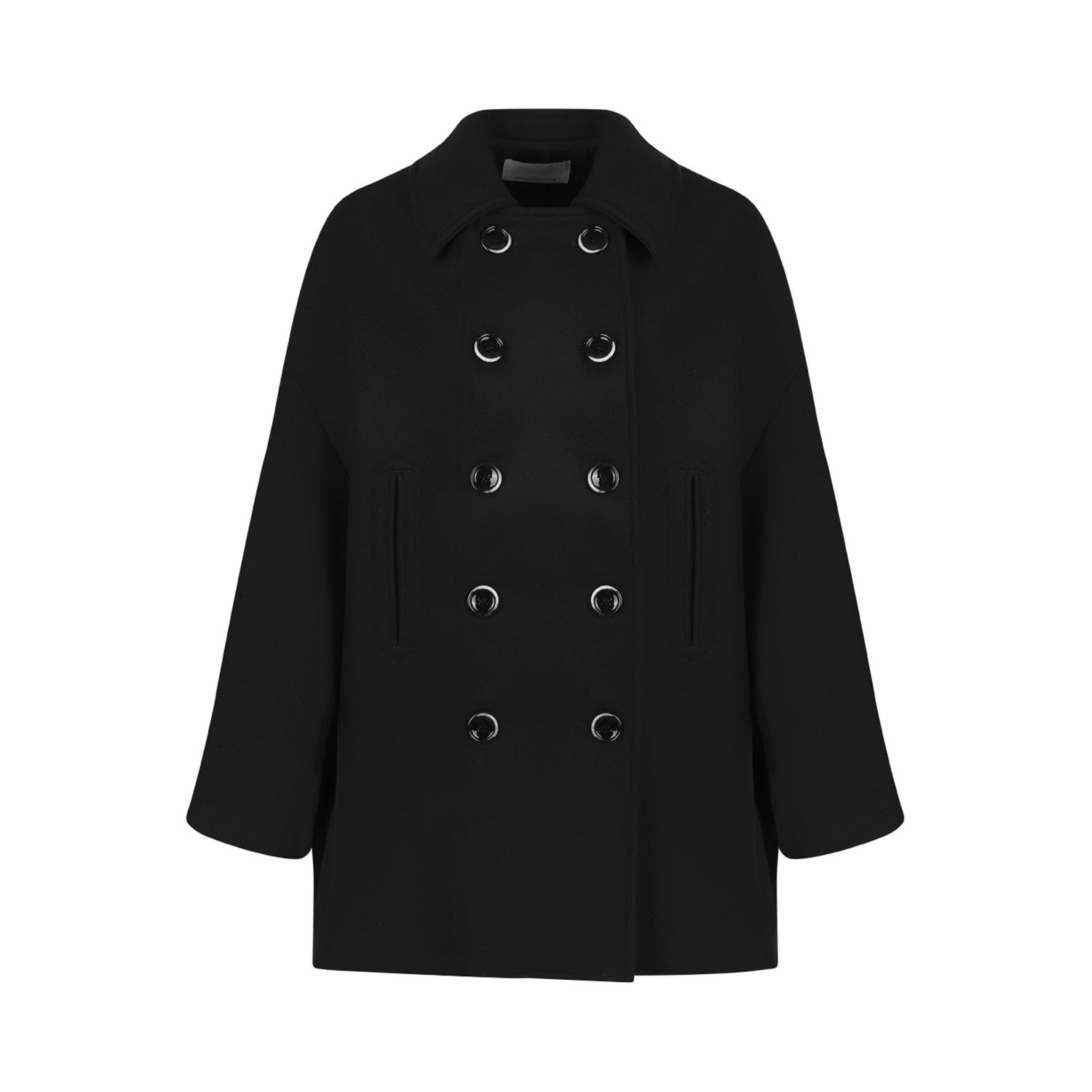 Nine In The Morning Dark Blue Short Coat. Dark blue short coat with shirt neck, front button fastening, long sleeves and two front pockets.