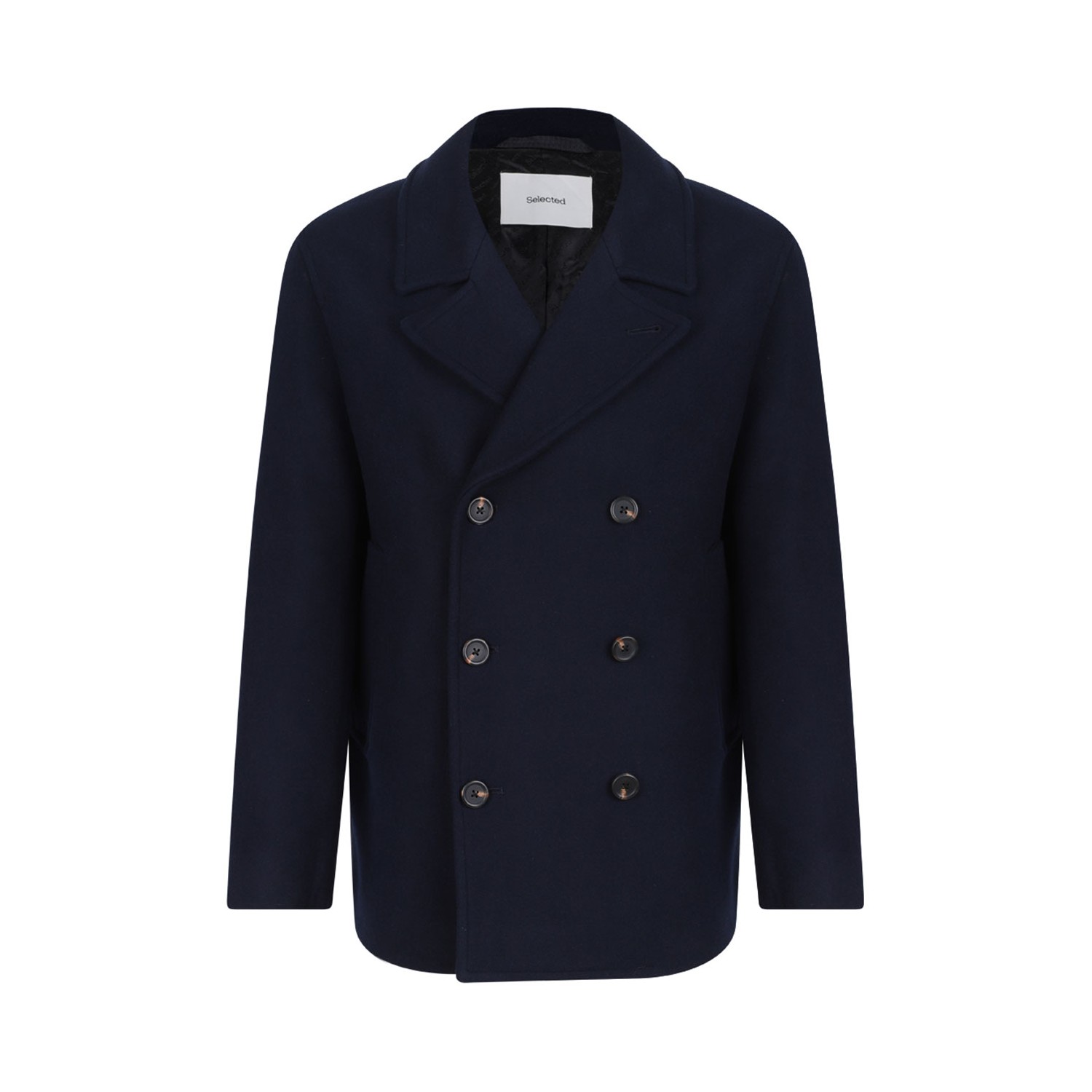 Selected Navy Blue Wool Caban. Navy blue wool blend peacoat with large lapel collar, double breasted buttons, welted side pockets.