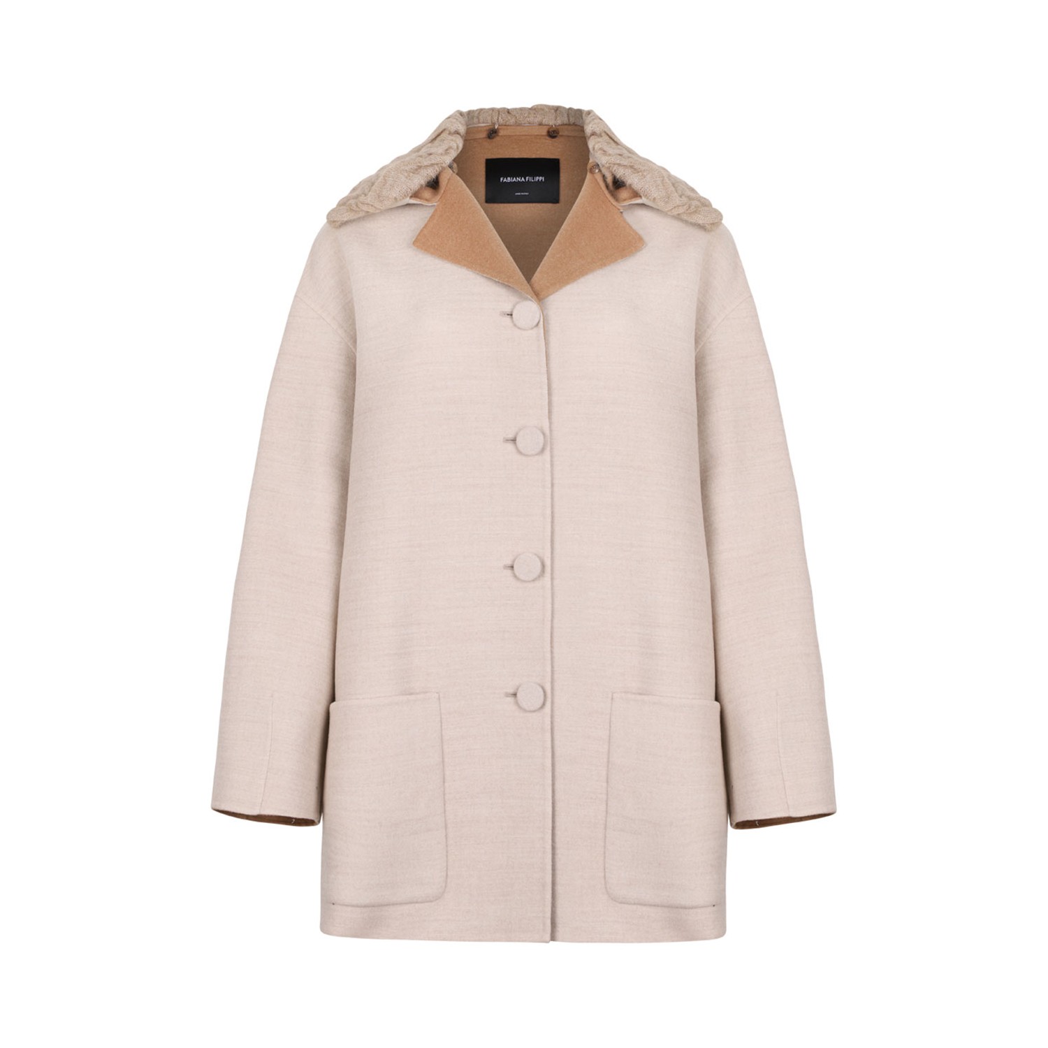 Fabiana Filippi Cream Double Wool Cabin. A refined pea coat in fine double wool, a sophisticated and enveloping hand-knit fabric. Featuring a detachable mohair collar, a detail that enhances its versatility, it is produced entirely in Italy using sustainable processes.