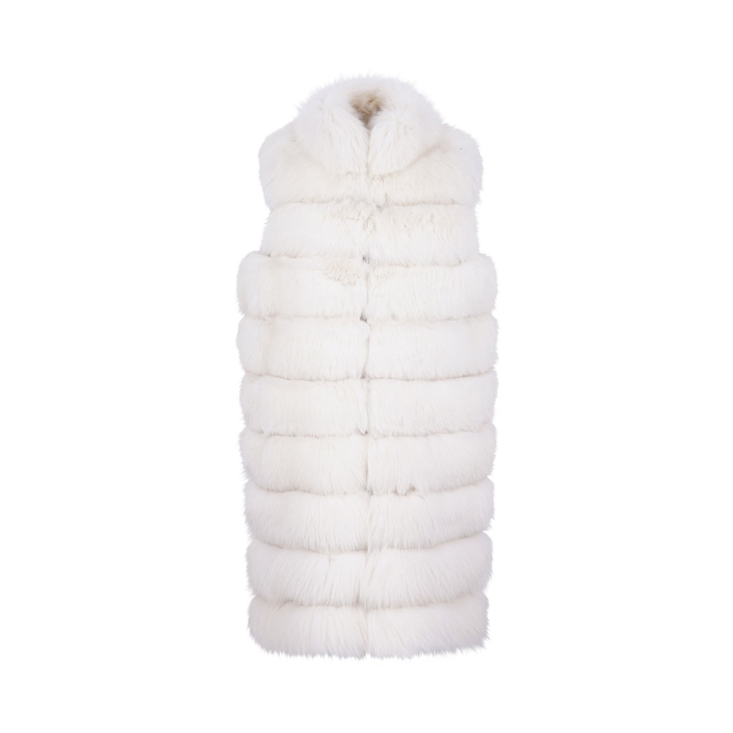 Antonio Arnesano White Fox Fur Long Vest with High Collar. Luxurious white fox fur long vest by Antonio Arnesano, crafted for exceptional softness, warmth, and sophisticated style. This voluminous piece features a high collar for elegance and protection, a sleeveless design for a modern, versatile silhouette, and a long length that adds a graceful, elongating effect. The plush, fluffy texture of the fox fur delivers a soft, inviting feel, while the light brown hue provides a classic and refined statement. Perfect for layering over outfits to create a bold fashion look or to elevate everyday ensembles with luxurious flair.