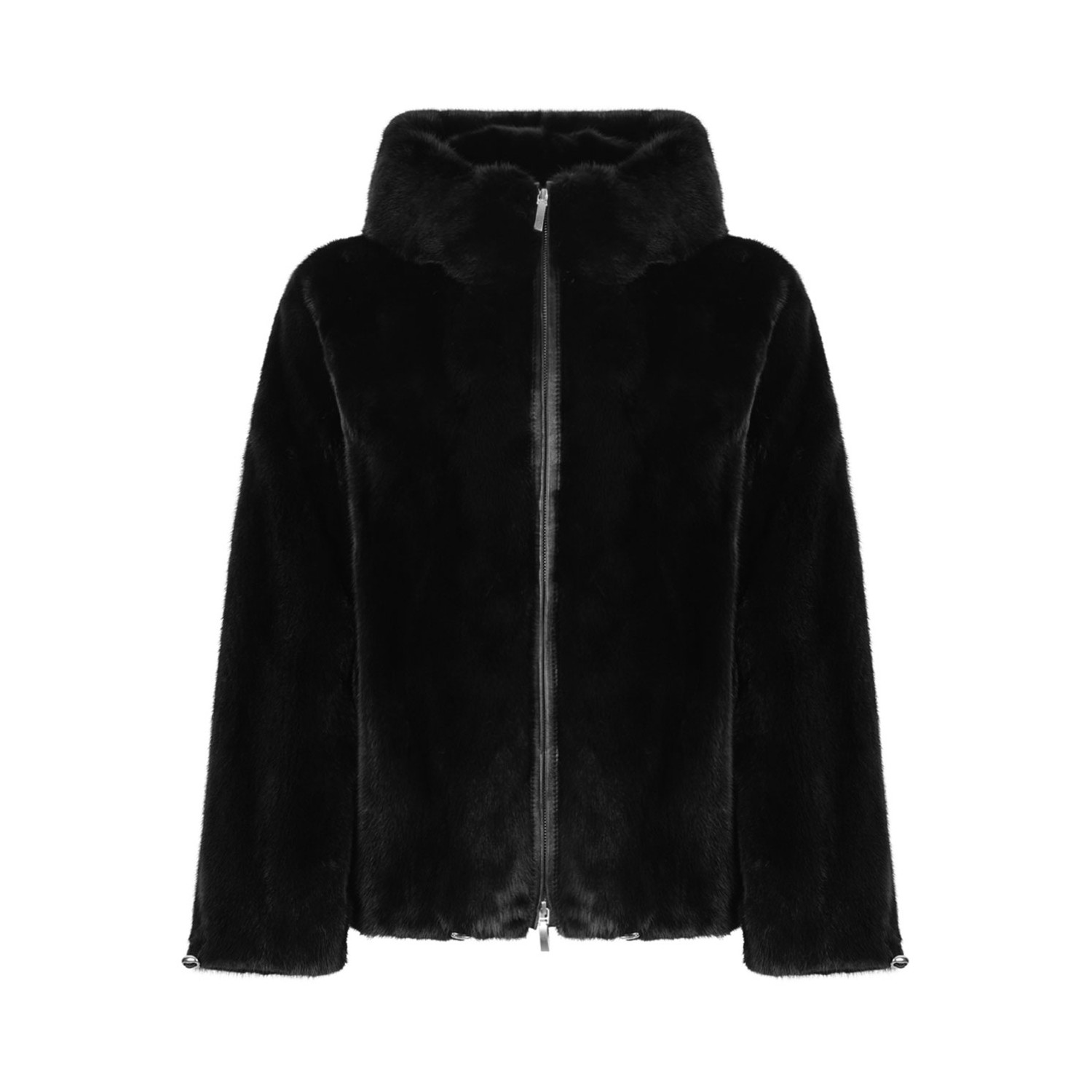 Antonio Arnesano Black Mink Fur Coat with Hood. Luxurious black mink fur coat by Antonio Arnesano, designed for ultimate softness and elegance. This sophisticated piece features a cozy hood, ideal for warmth and style, and a front zip closure for a modern, secure fit with long sleeves. The rich black hue enhances the plush, velvety texture of the fur, offering a soft and inviting feel. Perfect for making a statement on special occasions or elevating everyday ensembles, this coat embodies timeless luxury, comfort, and impeccable craftsmanship.