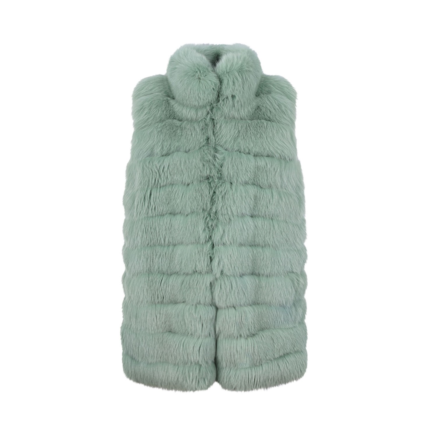 Antonio Arnesano Light Green Fox Fur Coat with High Collar. Luxurious light green fox fur coat by Antonio Arnesano, designed for exceptional softness, warmth, and eye-catching style. This voluminous piece features a high collar for added elegance and protection, long sleeves that enhance the classic silhouette, and a front closure for a sleek and secure fit. The plush, fluffy texture of the fox fur provides a soft, inviting feel, while the light green hue adds a fresh, playful yet sophisticated touch. Perfect for making a bold fashion statement or elevating everyday ensembles with luxurious charm.