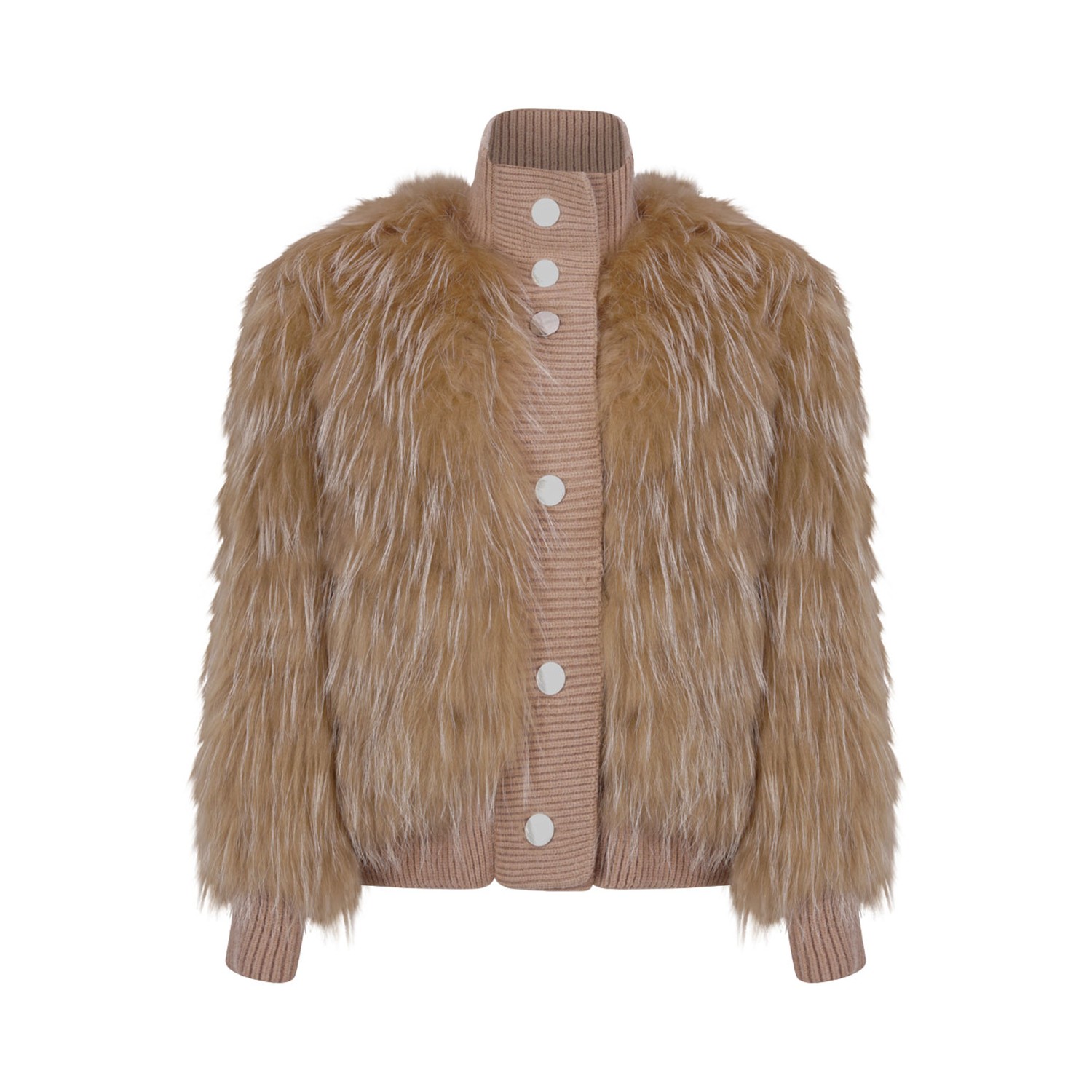Sand Raccoon Fur Bomber Jacket with High Collar