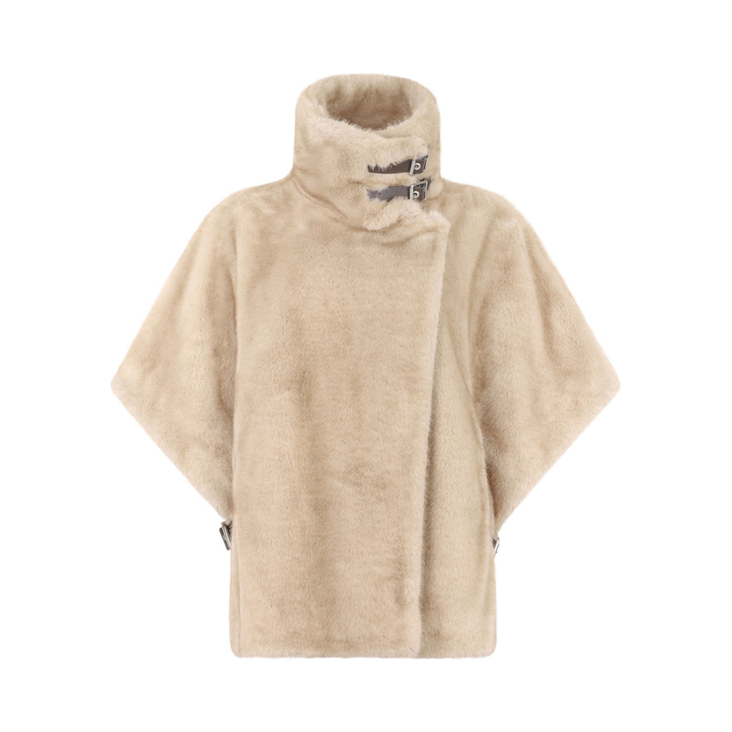 Pinko Light Beige High Neck Cape Coat. Light beige high neck cape coat with short sleeves, concealed fastening and welt pockets.