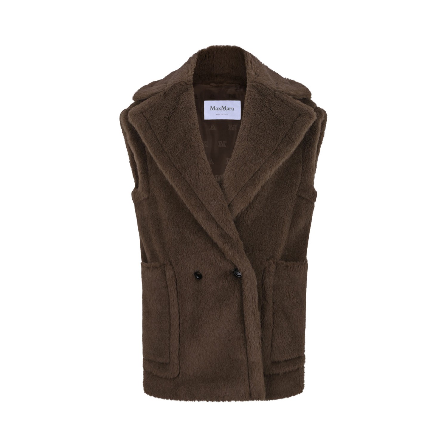 Max Mara Alpaca Wool Teddy Vest. Brown double-breasted vest with oversized volume. Teddy fabric vest made of alpaca and wool on a silk base, wide line Front closure with 2 visible buttons, large patch pockets on the front, lined in stretch Monogram jacquard fabric.
