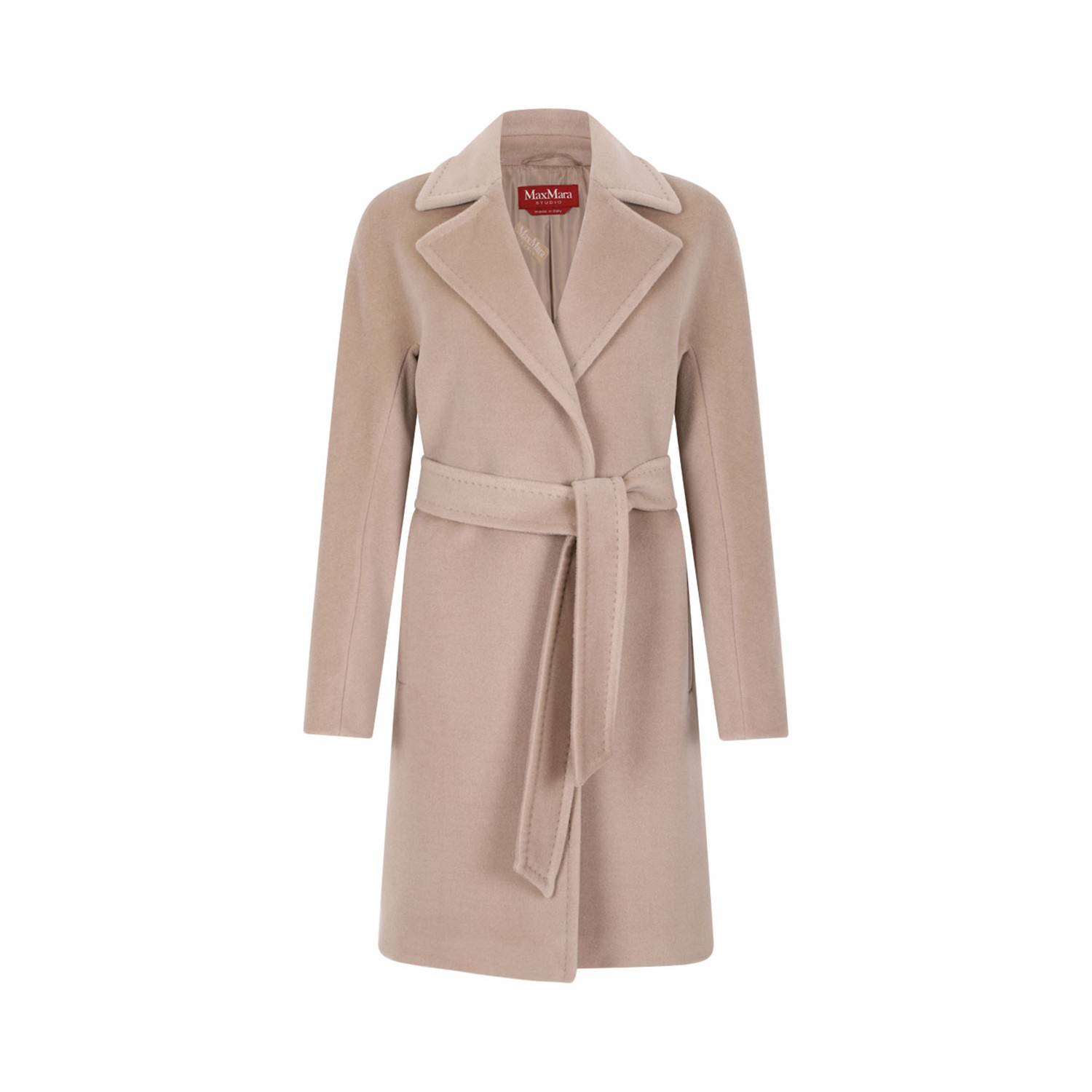 Max Mara Beige Beaver Wool Dressing Gown Coat. Beige pure wool beaver coat with straight line, classic lapel collar, long kimono sleeves. Closure with matching belt at the waist, welt pockets on the sides and tailored cuffs.