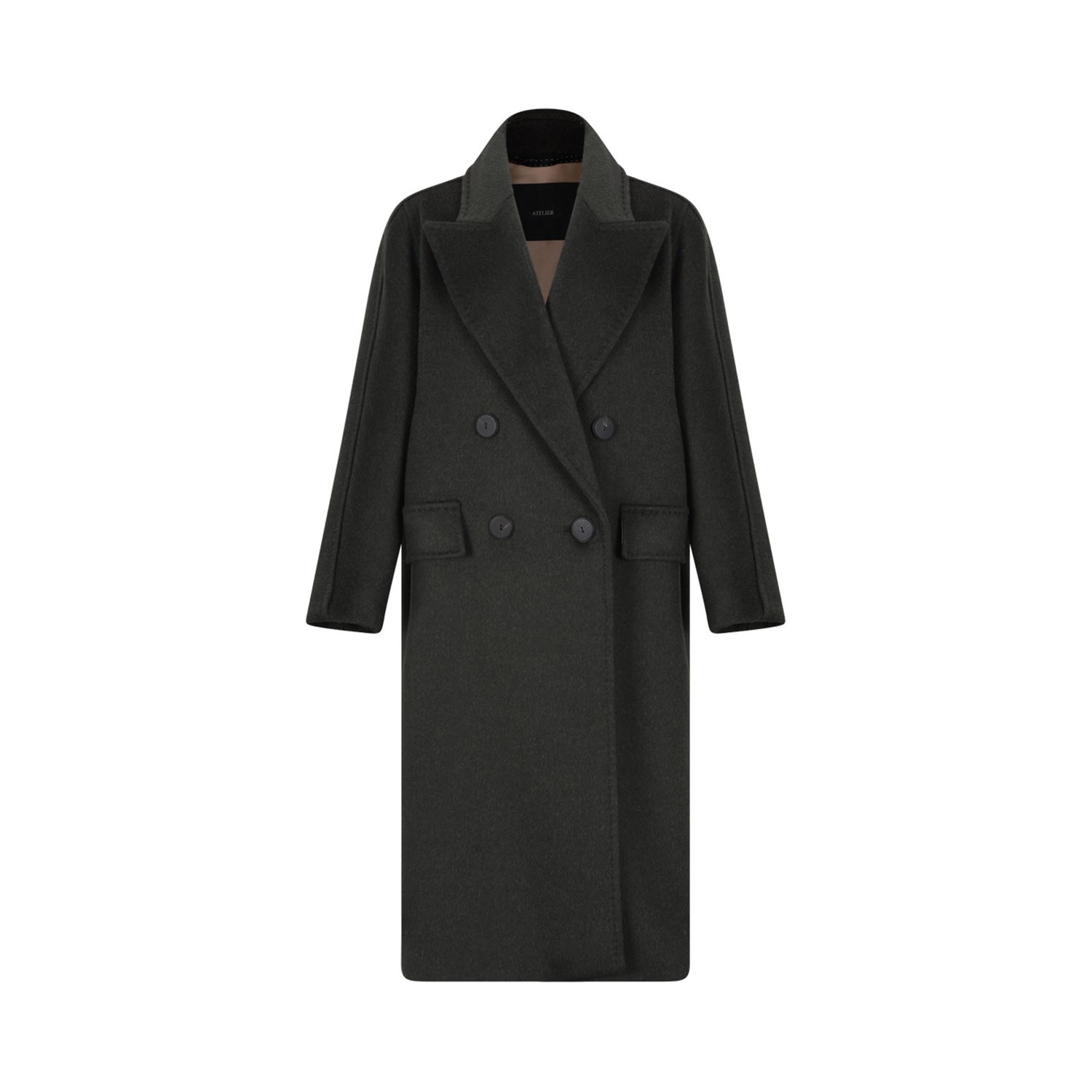 Max Mara Dark Green Oversized Coat In Cashmere. Pile-finish in cashmere, alpaca, and wool. Its main characteristic is its soft, warm, and extremely lustrous lustre, thanks to the fine fibers used. The melange colors are particularly deep and rich.Silhouette: Oversized men's style, with a cross-body fit. It can also be easily worn over a jacket.