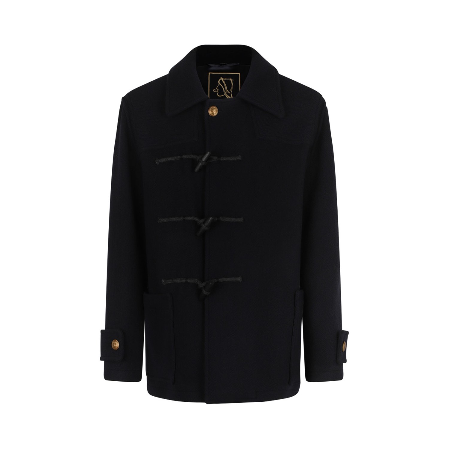 Sealup Short Wool Duffle Coat. Short duffle coat with a structured yet refined line, made of fine wool fabric with a smooth and compact texture. Featuring a classic shirt collar, front closure with horn toggles and leather loops, and a single button at the neck. Large patch pockets with flap and buttoned straps at the cuffs complete the design. A timeless piece combining elegance and functionality in true Sealup style.