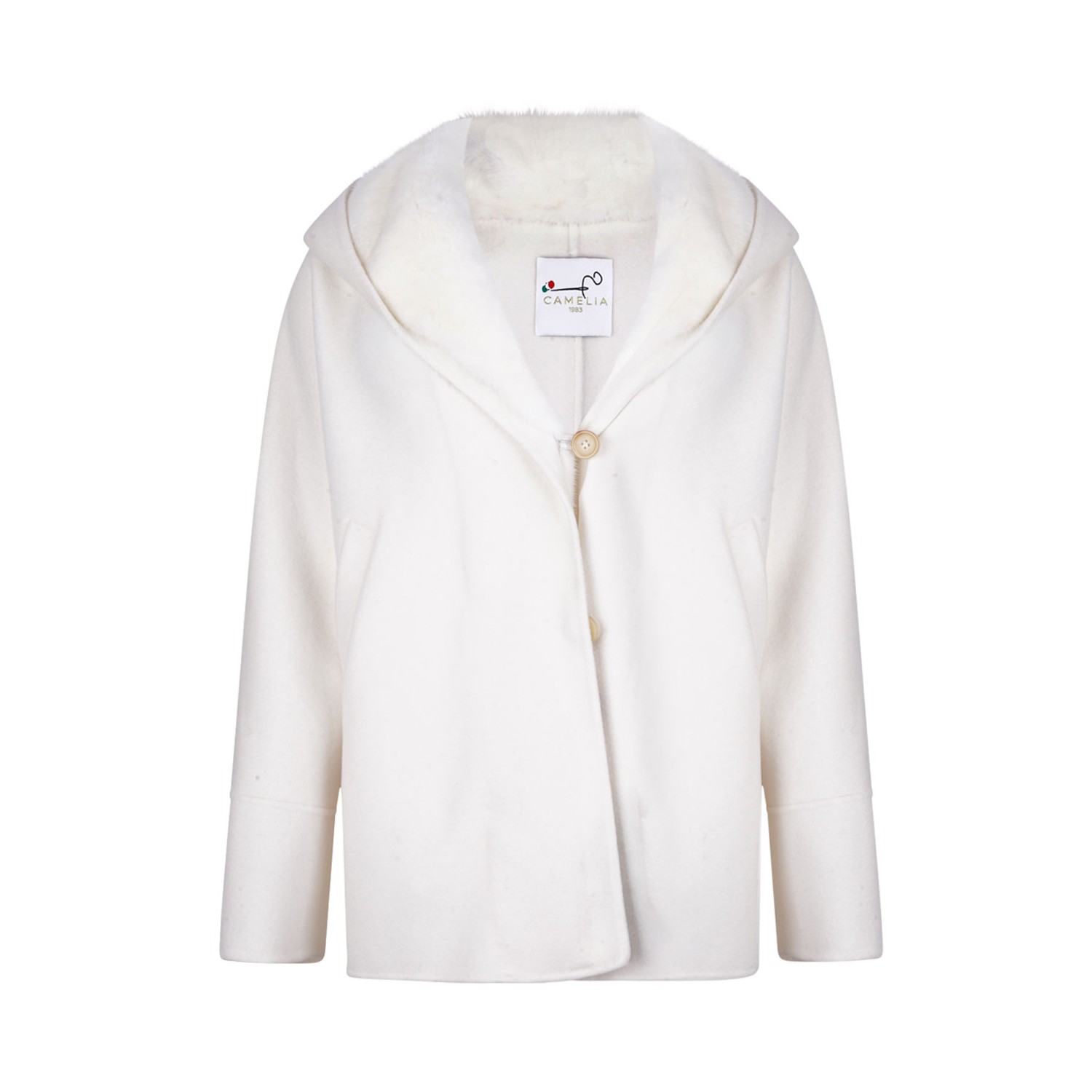 White Mink and Cashmere Jacket with Hood and V-Neck