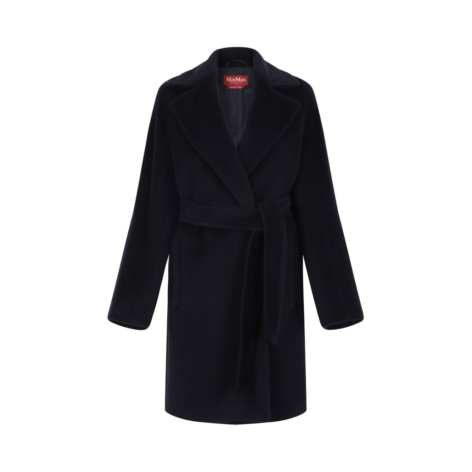 Max Mara Blue Beaver Wool Dressing Gown Coat. Blue pure wool beaver coat with straight line, classic lapel collar, long kimono sleeves. Closure with matching belt at the waist, welt pockets on the sides and tailored cuffs.