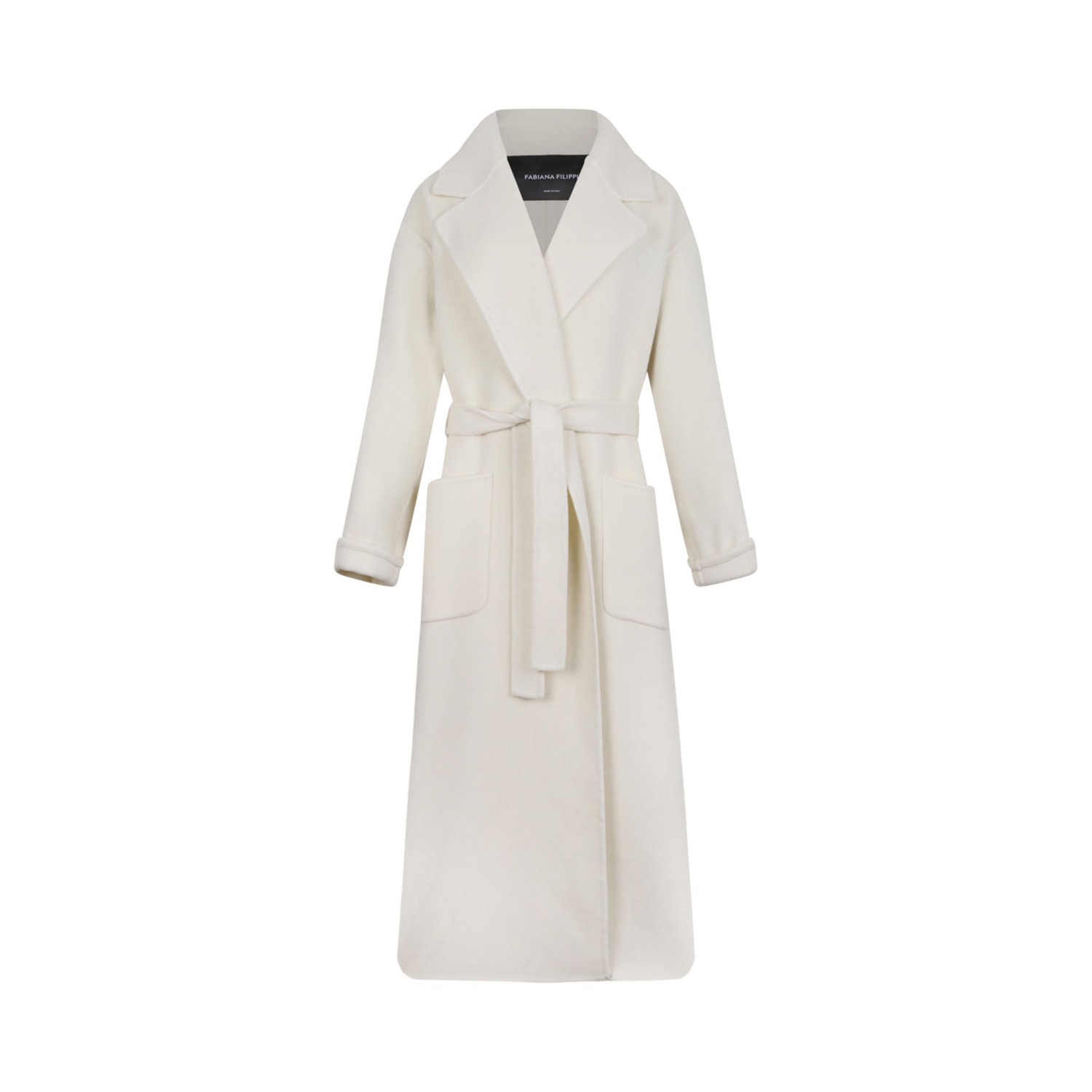 Fabiana Filippi White Double Wool And Soft Cashmere Coat. Elegant belted coat crafted from a luxurious double wool and soft cashmere blend, a sophisticated and enveloping hand-woven fabric. Featuring pockets and a dazzling diamond-cut lapel, it's entirely made in Italy using sustainable processes.