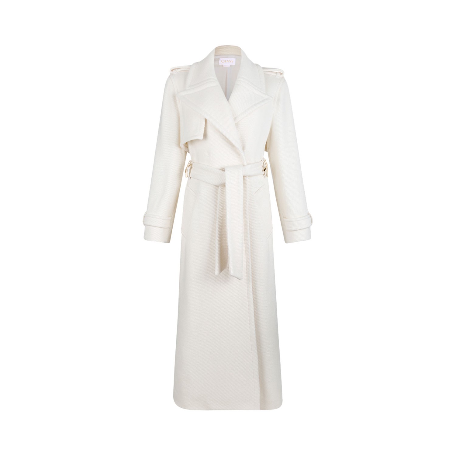Genny White Trench Coat. White long trench coat with v neck, long sleeves and belt.