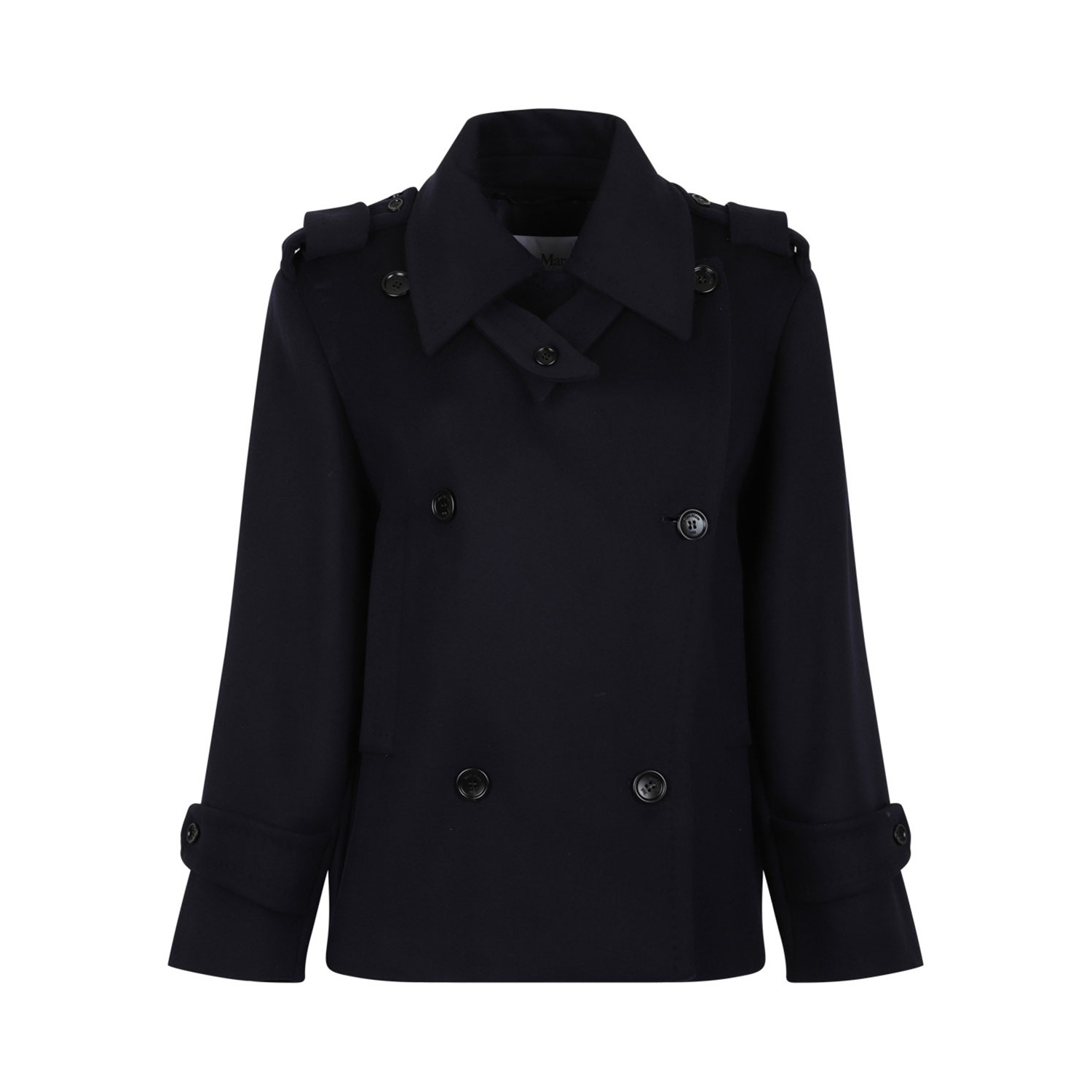 Max Mara Navy Blue Oversized Trench Coat. Navy blue short double-breasted coat made of luxurious wool and cashmere drap double cloth. The silhouette features incorporated shoulder pads that emphasise the oversized volume of the shoulders. The iconic trench coat-style details finish the garment: dual-use shirt collar, epaulettes on the shoulders, cuff straps, welt pockets and lateral vents on the back. The lined style fastened with visible buttons.