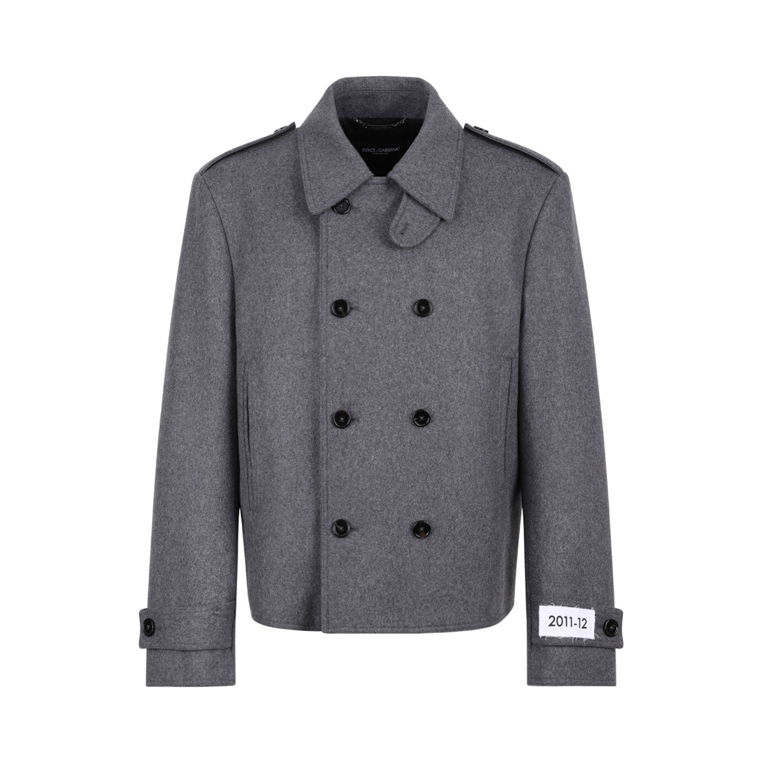 Dolce & Gabbana Gray Double-Breasted Cashmere-Blend Pea Coat. Gray double-breasted pea coat in vintage-look cashmere and wool with the Re-Edition label. Shirt collar, tab details on shoulders, button fastenings. Welt pockets on the exterior, strap and buttons on the cuffs. Branded metal tag underneath the collar and padded lining.