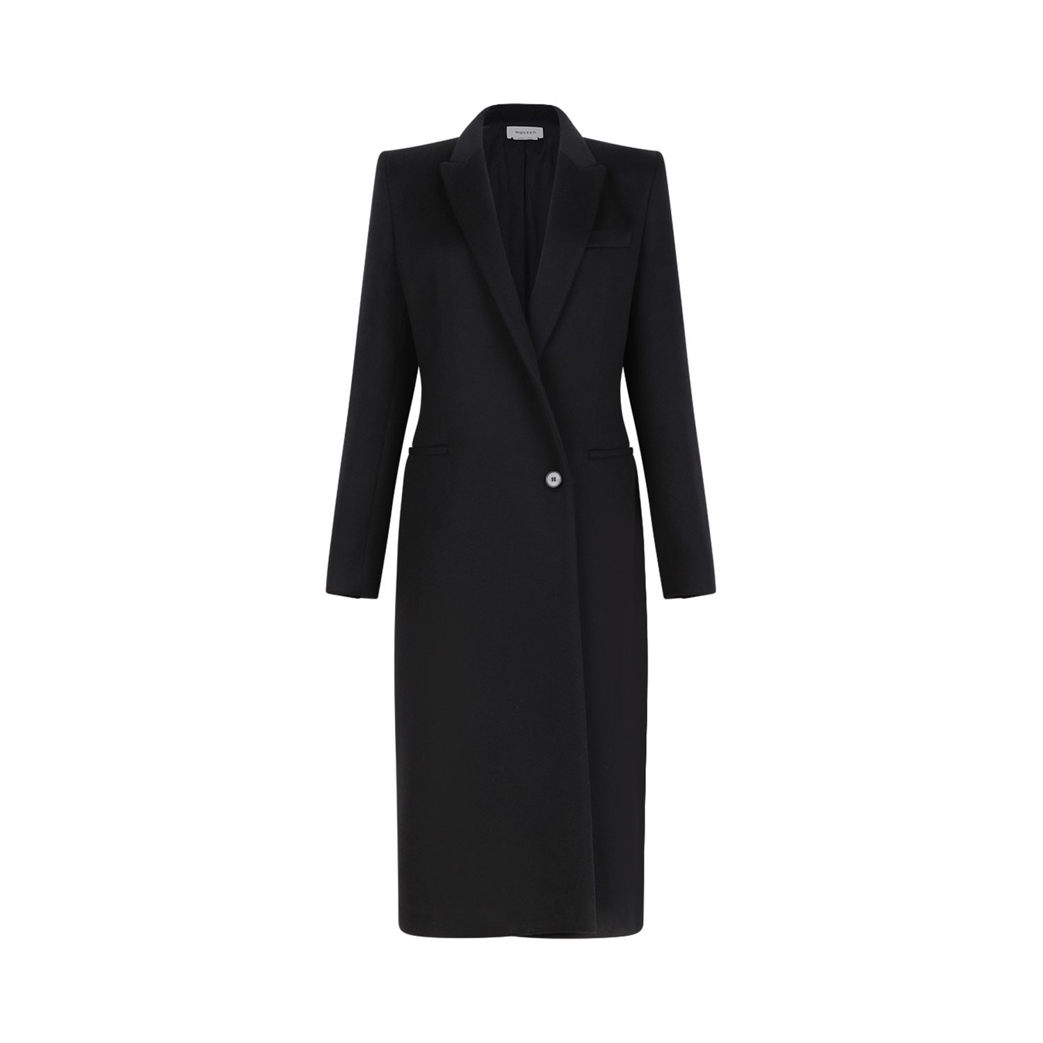 Alexander McQueen Black Stacked Shoulder Tailored Coat. Black cotton blend coat with , felted, stacked shoulders, tailored design. Double-breasted button fastening, peak lapels, long sleeves, buttoned cuffs, chest welt pocket. Two front welt pockets, central rear vent, full lining and straight hem.