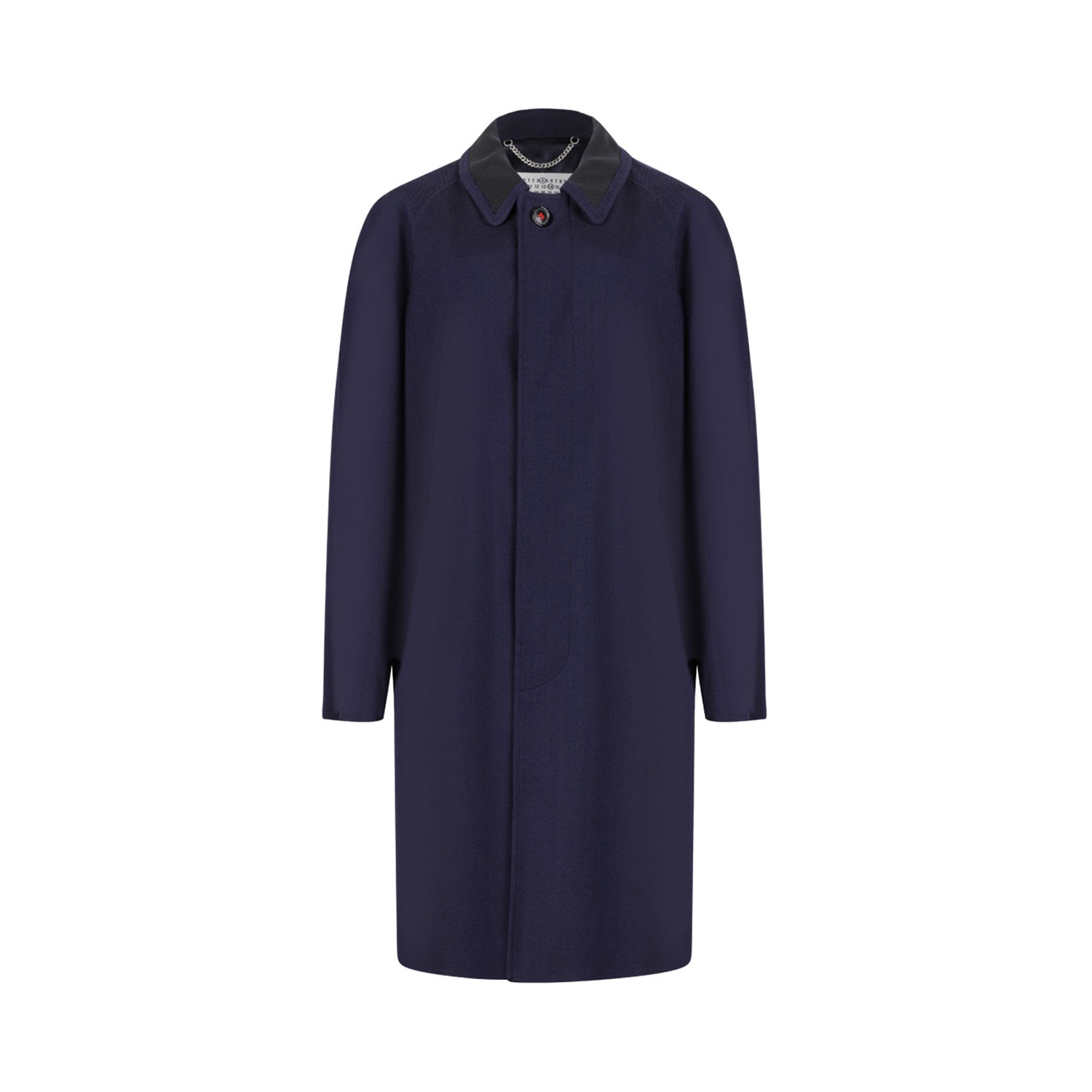 Maison Margiela Navy Blue Wool Viscose Coat. Navy blue wool viscose coat with contrasting collar and one button at the top. The rest of the fastening is hidden so as not to affect the line. Model completed by a single slit. On the back, Four stitches stand out , an undisputed characteristic of Maison Margiela: the opposite of a label.