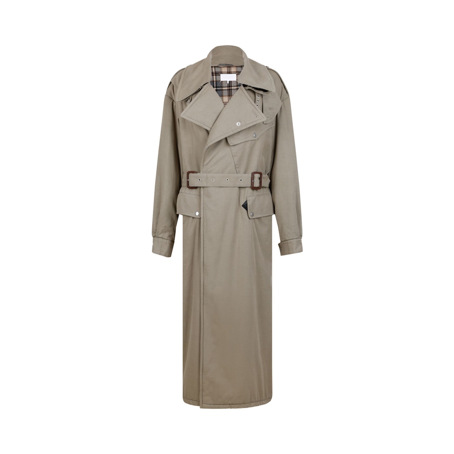 Maison Margiela Deconstructed Trench Coat. Raincoat presented in two tonal green colourway. Cut to a belted waist, the coat features flap pockets and a signature four stitch logo at the sleeve.