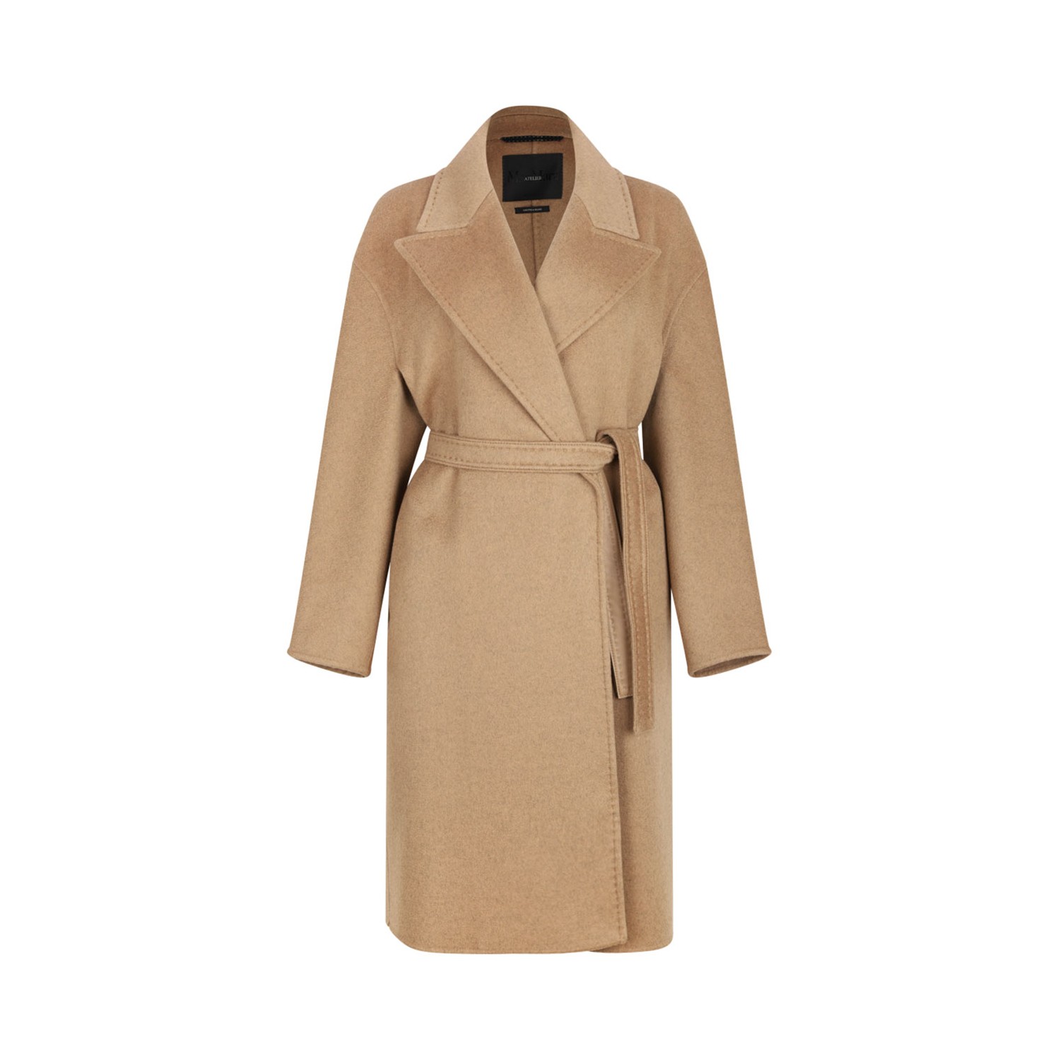 Max Mara Camel Coat With Unstructured Line. Camel coat made of double pure cashmere fabric with a puffy and opaque appearance. Coat with unstructured line, slightly cocoon volume, sleeveless front and kimono back. Tailoring stitch as finishing, leather details for undercollar, pocket opening, inner side belt.
