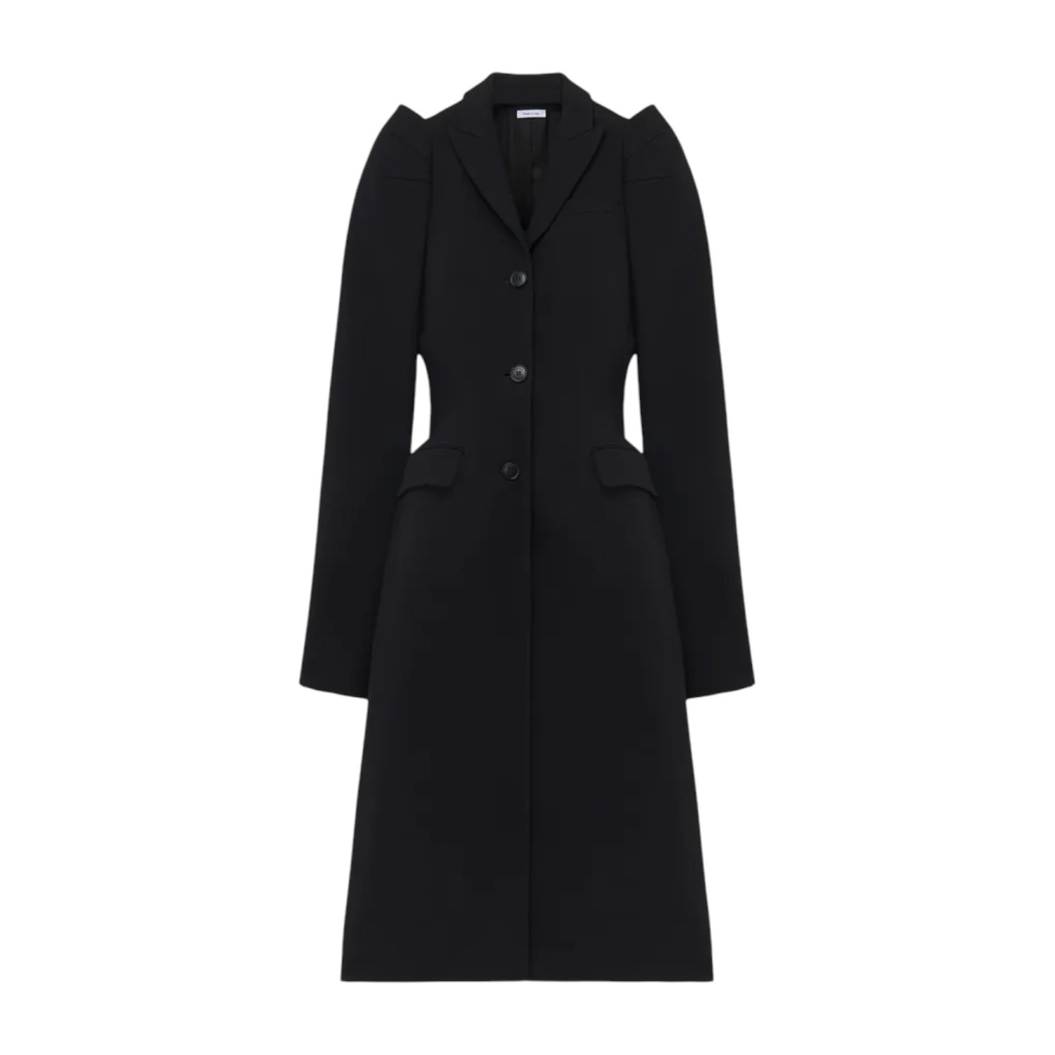 Alexander McQueen Black Pinched Shoulder Coat. Black shoulder single-breasted coat in light wool silk. Peak lapels, side flap pockets and bombe hips. Finished with a T-Bar chain back detail.