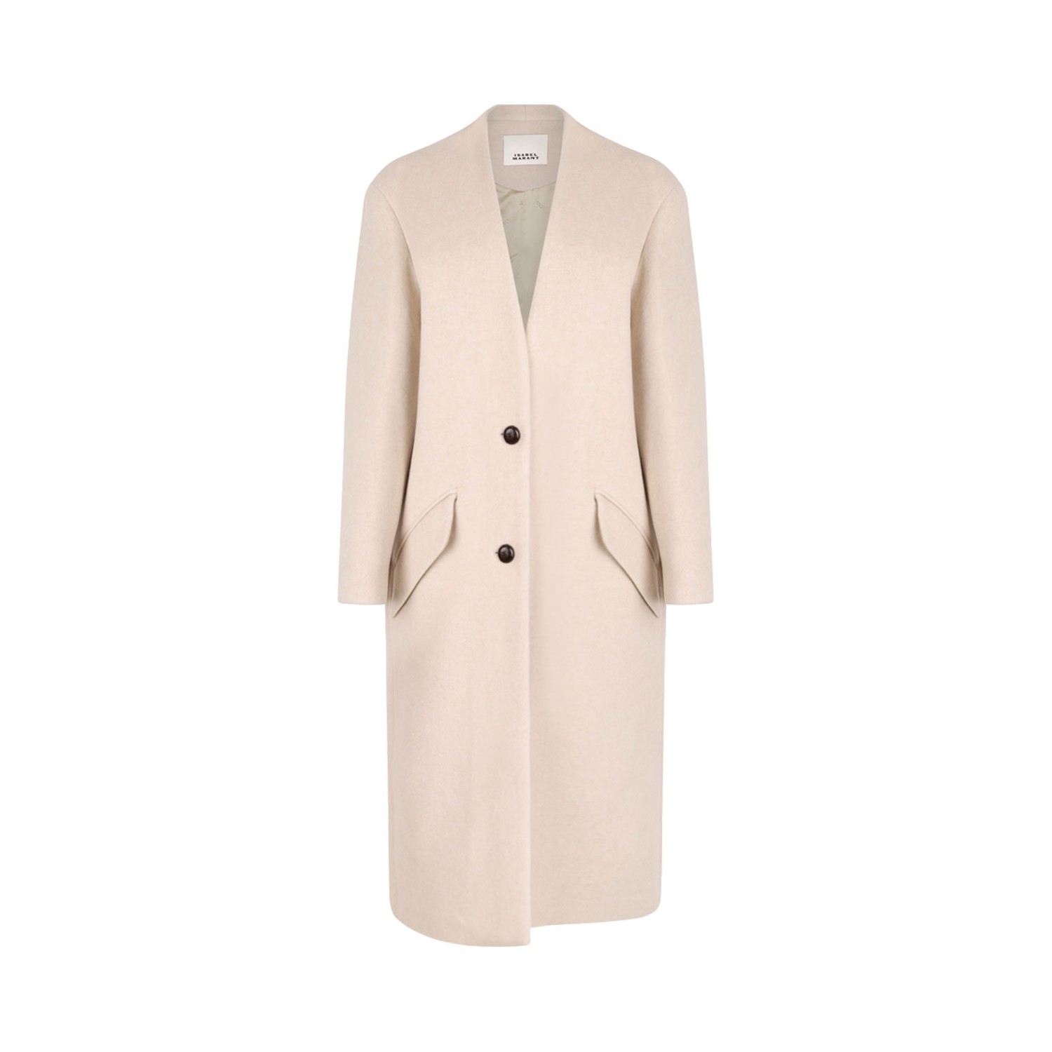 Isabel Marant Ecru Florane Wool Blend Long Coat. Ecru wool blend long coat with button closure, ong sleeves. Flap pockets, satin lining with Isabel Marant logos, without collar.