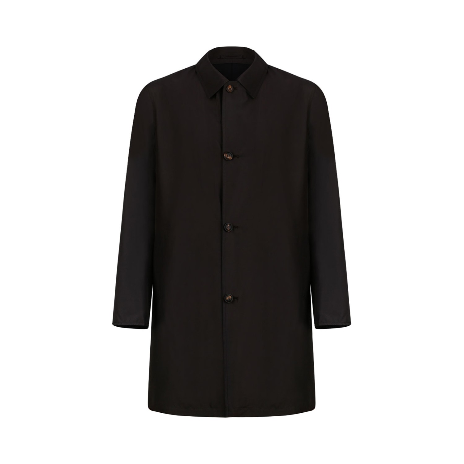 Kired Dark Brown Single-Breasted Overcoat. Single-breasted overcoat in dark brown technical wool blend, crafted from smooth water-repellent fabric with a clean, refined finish. Designed with a classic shirt collar and front button fastening, it features side welt pockets and a streamlined silhouette that enhances its contemporary elegance. The regular fit and lightweight construction ensure comfort and versatility, making this tailored coat an essential outerwear piece for both business and smart-casual looks.