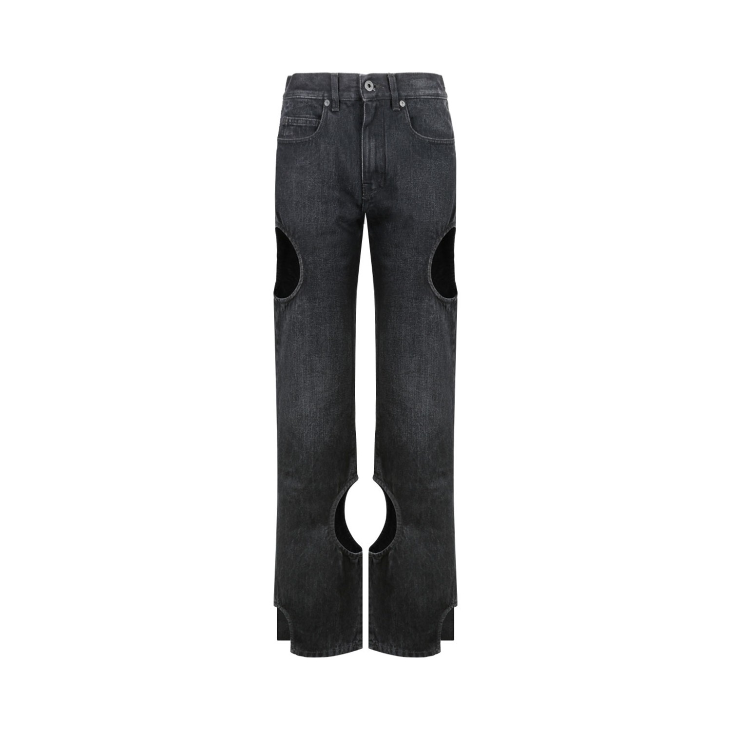 Off White Black Meteor Jeans. Black cotton jeans, high waisted, belt loops. Concealed fly and button fastening. Classic five pockets, cut out detailing and straight leg.